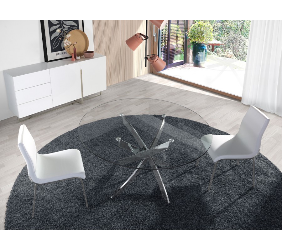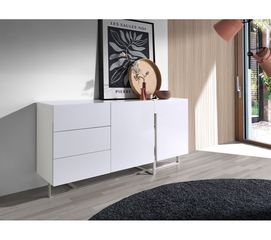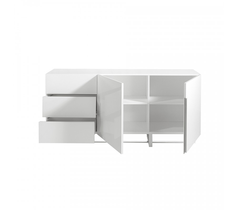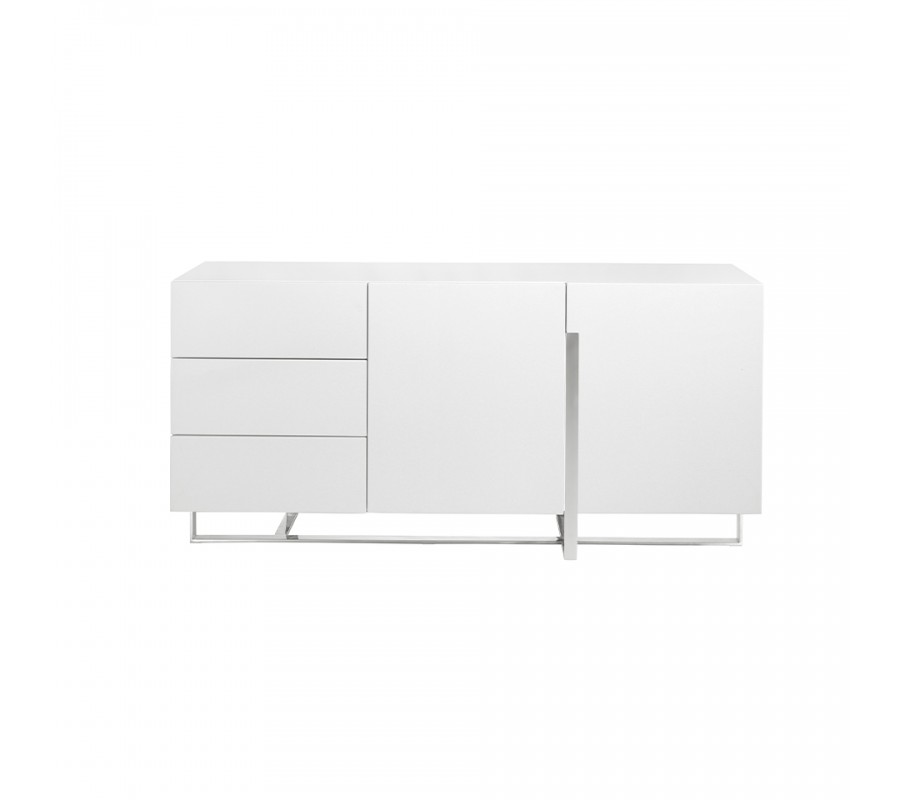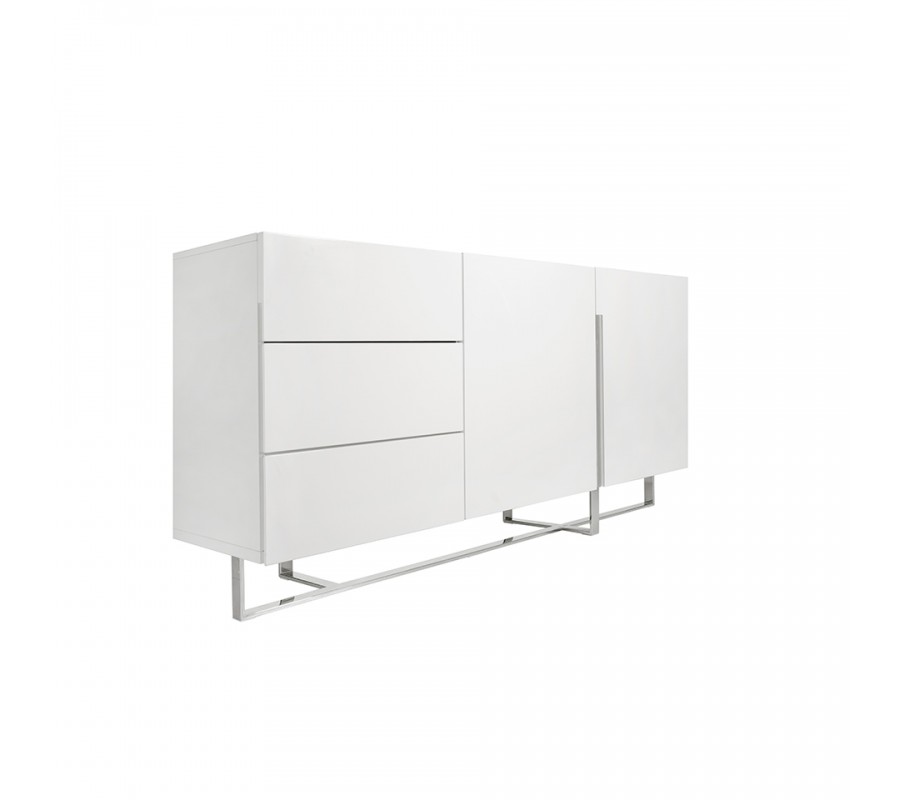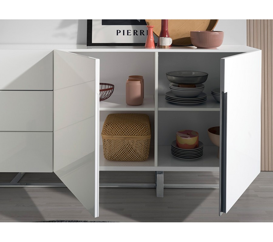 Úložný priestor je vyrobený z kvalitných MDF dosiek a pokrýva ho žiarivý biely náter s lesklým finišom. Táto povrchová úprava výborne korešponduje s podstavou z nehrdzavejúcej ocele v lesklom chrómovom prevedení. Príborník pôsobí ultra moderným dojmom, k čomu prispieva aj jeho striktne lineárna silueta.