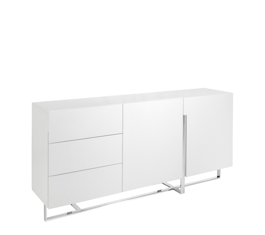 Luxusný minimalistický biely príborník Urbano s chrómovou podstavou s dvomi dvierkami a tromi zásuvkami 180 cm