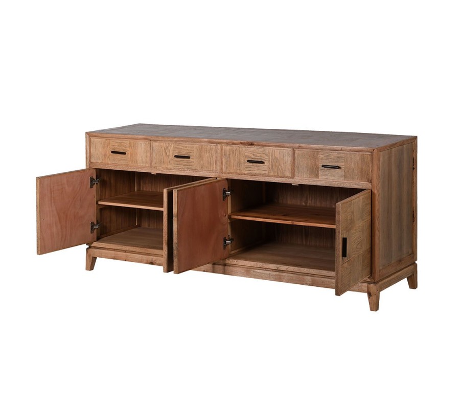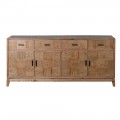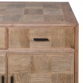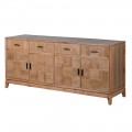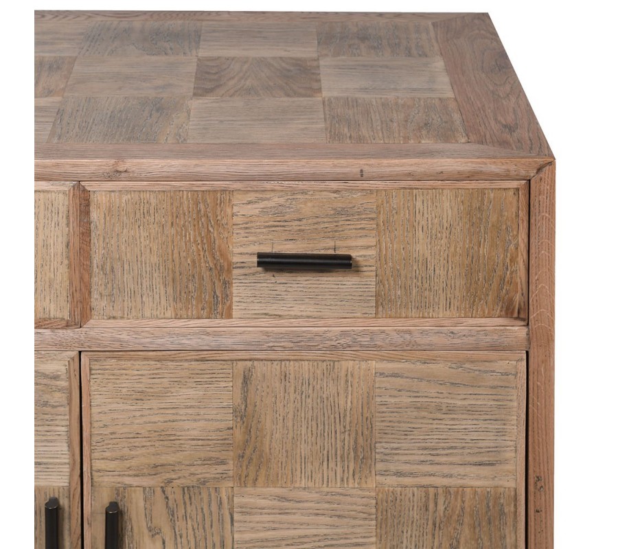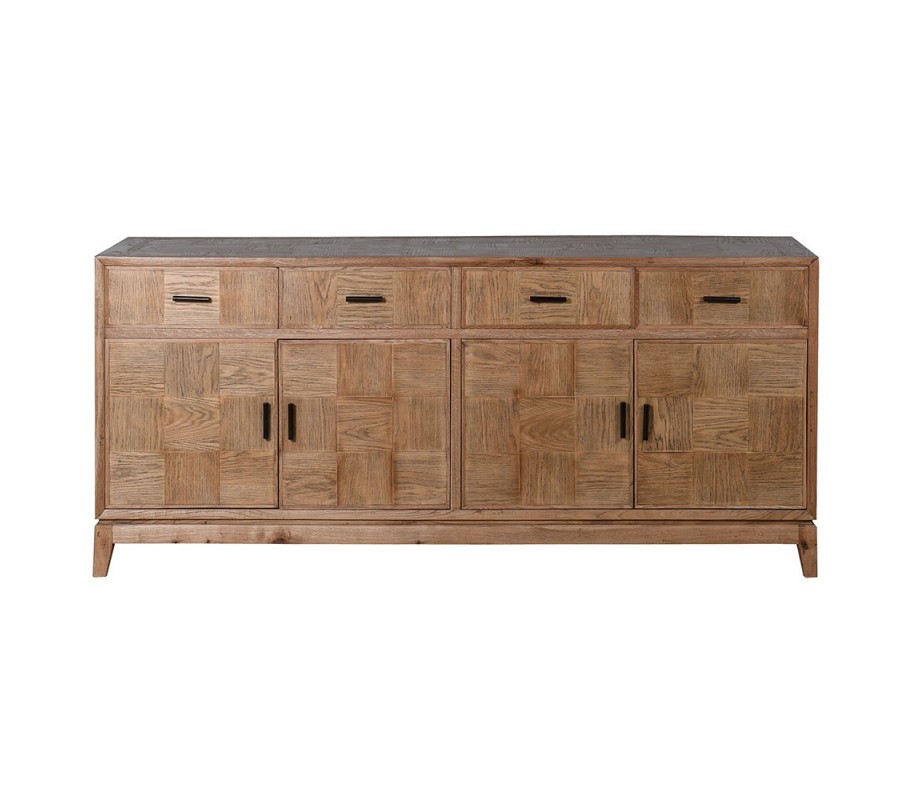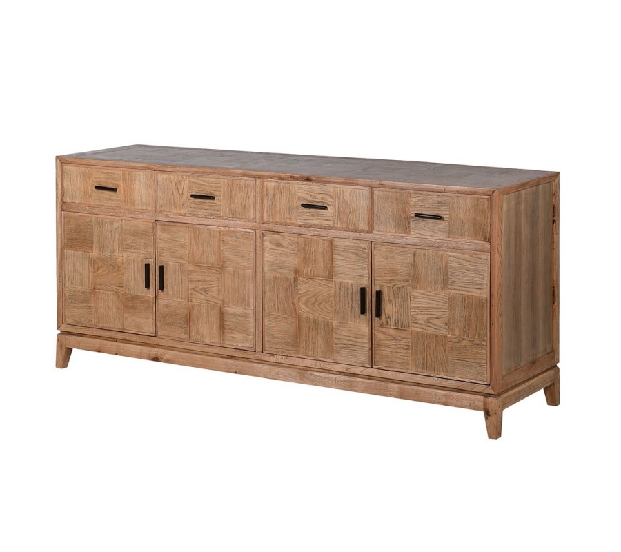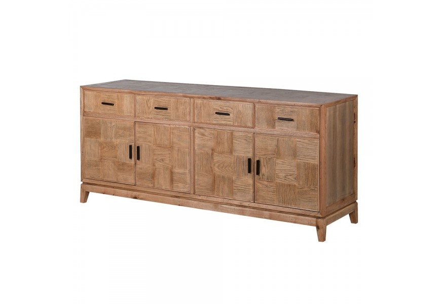 Dizajnový masívny štvordverový príborník so štýlovým vzhľadom osvieži interiér a dodá mu šmrnc.Pri dizajne príborníka dominuje výzdoba na jeho dvierkach a zásuvkách, zložená z precízne opracovaných štvorcových dosiek, ktoré sú vzájomne na seba uložené tak, že smer letokruhov susediacich dosiek je 90 stupňov. Precízne opracovane štvorcové doštičky vytvárajú parketový vzor, a vďaka tomu že sú štvorcové pripomínajú šachovnicu. Príborník je vyrobený z kvalitného dubového dreva v teplej hnedej farbe v svetlejšom odtieni s hladkým matným povrchom. Vďaka výraznej štruktúre, zafarbeniu dreva a jednoduchým líniám sa príborník nesie vo vidieckom štýle. Disponuje štyrmi zásuvkami a štyrmi dvierkami, ktoré sú doplnené o čierne kovové úchytky. Príborník má štyri nízke hranaté nožičky, upevnené s doskami, ktoré sa navzájom prepájajú a vytvárajú tak nosnú konštrukciu. Nožičky sa mierne zošikmujú smerom von.