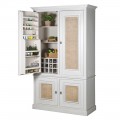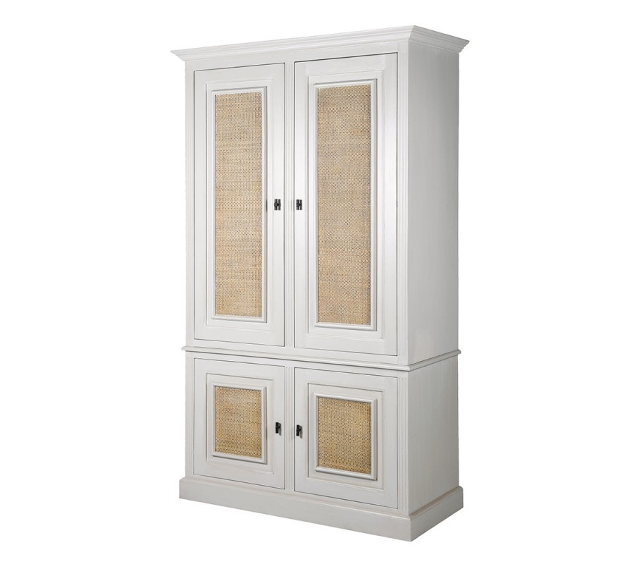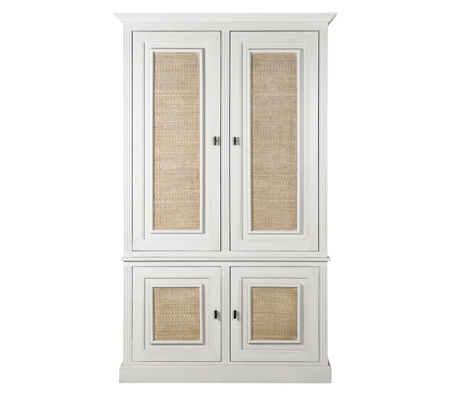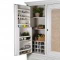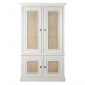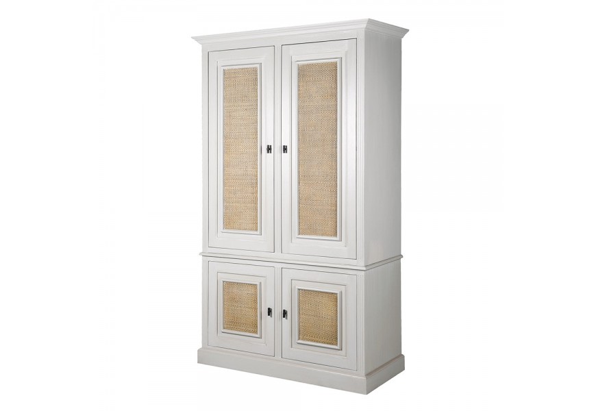 Luxusný vidiecky vysoký príborník Perell so štyrmi dvierkami s ozdobným ratanovým výpletom biela béžová 220 cm