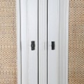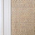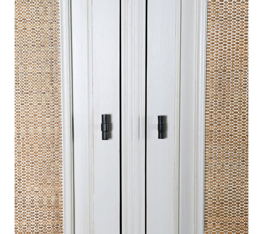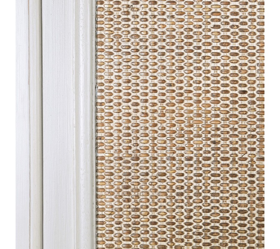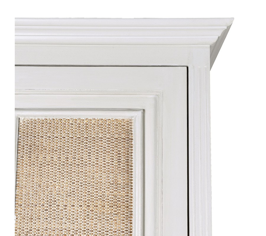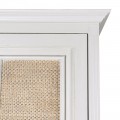 Príborník je vyrobený z kombinácie masívneho dreva a dyhy. Povrchy, vrátane tých vnútorných, pokrýva biely náter a minimalistické lineárne reliéfne zdobenie. Dvierka majú kazetový dizajn so zníženou strednou časťou s ratanovým výpletom v odtieňoch svetlej hnedej a béžovej. Efekt zošúchanej farby pôsobí pôvabným vintage dojmom a drobný vzor vytvára zaujímavý štrukturálny kontrast k hladkým dreveným povrchom.