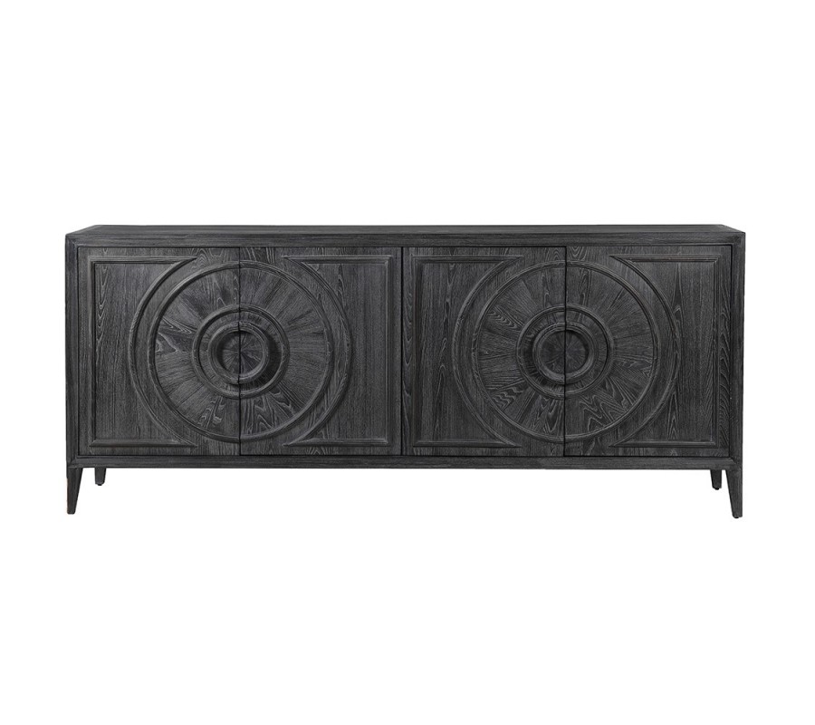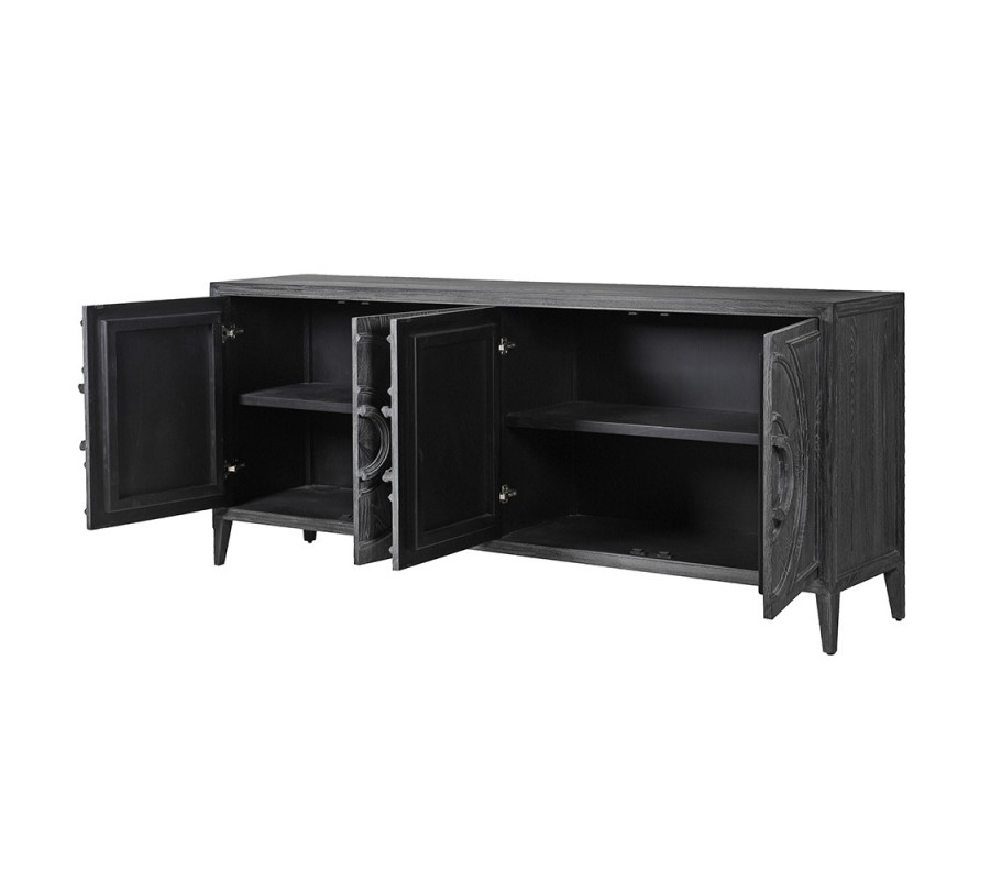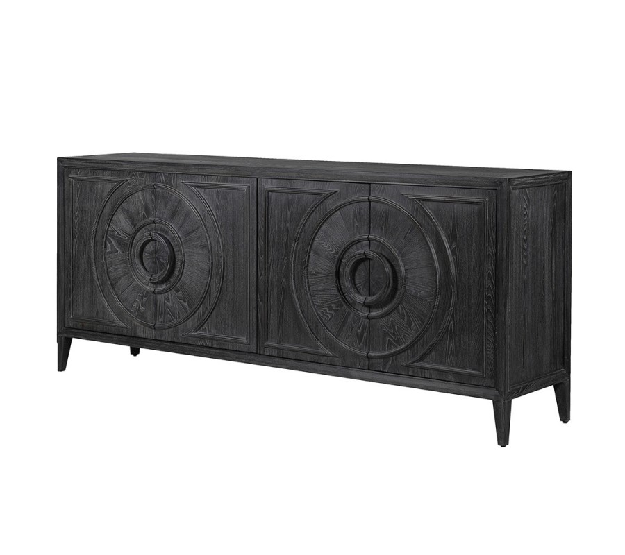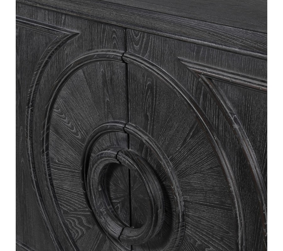 Luxusný artdeco príborník Onyx obdĺžnikového tvaru z masívneho čierneho dreva so štyrmi dvierkami s kruhovými ornamentmi 210 cm