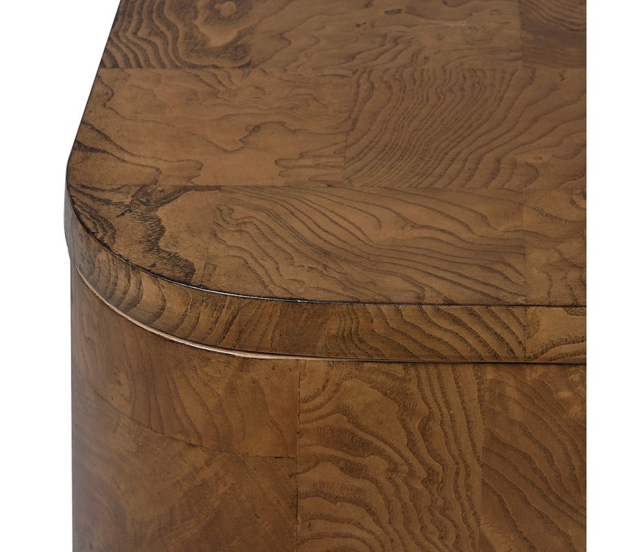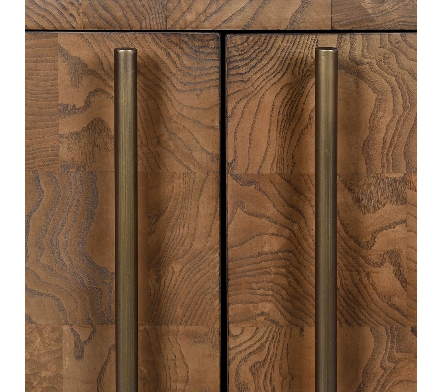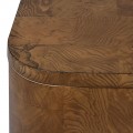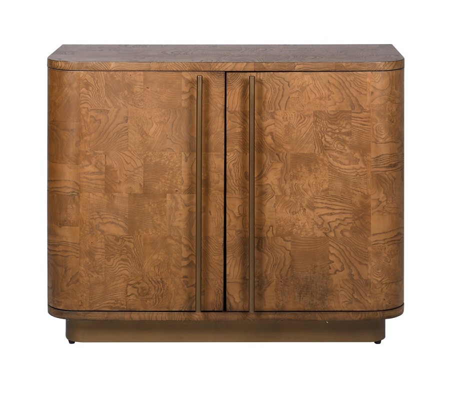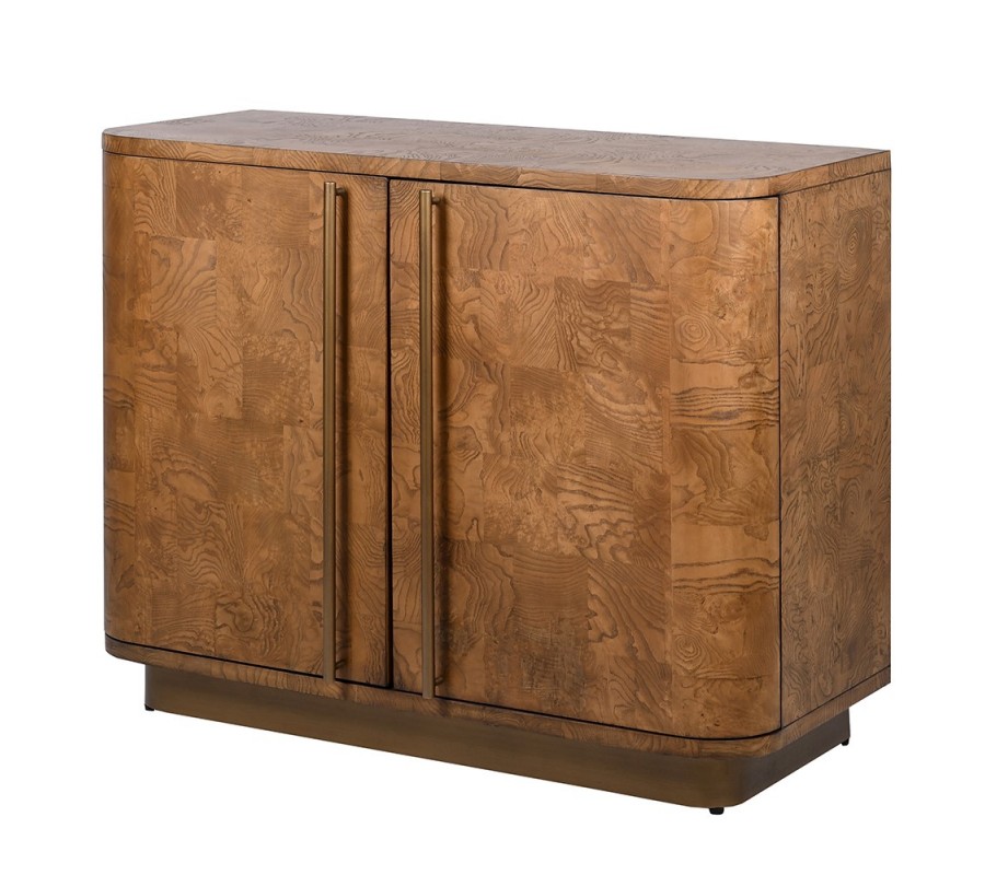 Skrinka je vyrobená z dyhovaného dreva burl, ktoré patrí medzi najvýnimočnejšie materiály v nábytkárstve. Získava sa z nevypučaných výhonkov stromov. Toto drevo je vďaka atypickému rastu tvrdšie ako zvyšok stromu a pýši sa originálnou asymetrickou kresbou letokruhov. Netradičná štruktúra robí z každého kusu nábytku neopakovateľný originál a jeho príjemná paleta svetlých hnedých odtieňov prinesie do priestoru pocit tepla.