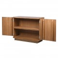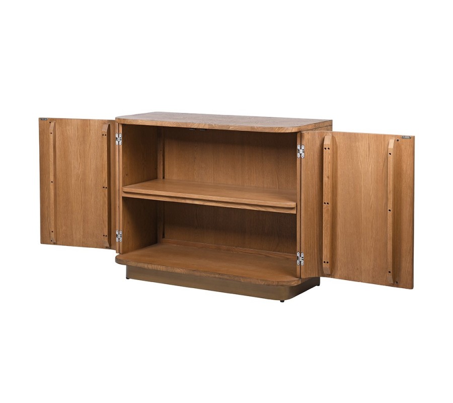 Farbu dreva skvele dopĺňa zlaté prevedenie kovových úchytiek a podstavy. Pôsobia luxusným dojmom a ich rovné geometrické tvary dodávajú skrinke nádych elegantného art deco štýlu. Úchytky sa tiahnu po celej výške dvierok a vytvárajú tak dekoračný prvok nábytku. Podstava je obdĺžniková a na nej je umiestnený mohutný úložný priestor s výrazne zaoblenými hranami, inšpirovanými retro nábytkom. Interiér za dvojitými dvierkami predeľuje polica a skrinka vám tak poskytuje dostatok úložného priestoru na riad, textílie či barové náčinie.