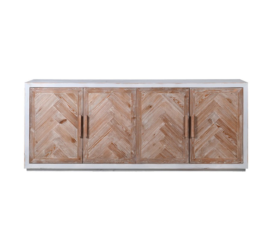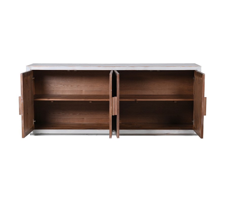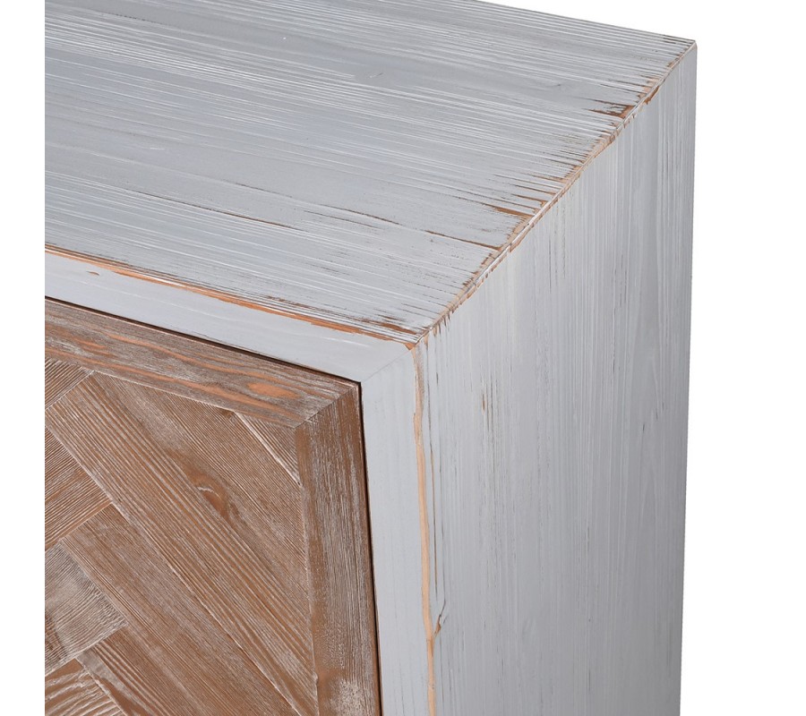 Príborník má obdĺžnikový tvar s čistými líniami, čo mu dodáva jednoduchý a elegantný vzhľad. Farba je kombináciou jemnej bielej patiny na ráme a prírodného hnedého odtieňa na dvierkach, ktoré zdôrazňujú textúru borovicového dreva. Povrch je matný, s jemnými stopami opracovania, ktoré dodávajú rustikálny charakter.
