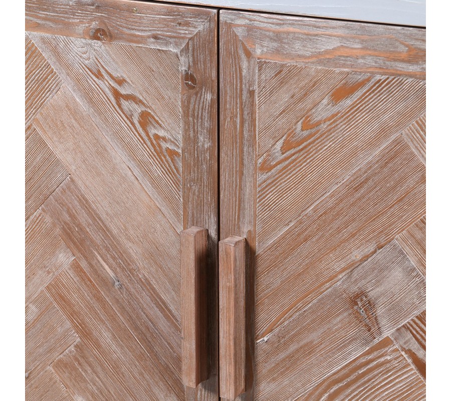 Dvierka sú štyri, na každom sú drevené dosky uložené v rybinovom vzore, čo vytvára dynamický a zaujímavý vizuálny prvok. Každé dvierka majú jednoduché vertikálne úchytky v kontrastnej farbe, ktoré zvyšujú praktickosť a estetiku. Vo vnútri sa nachádzajú dve poličky, ktoré ponúkajú dostatok úložného priestoru.