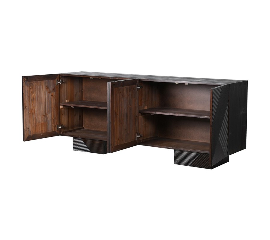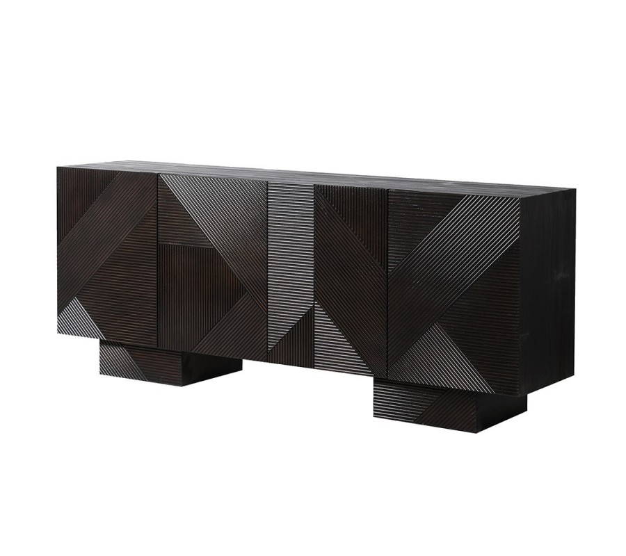 Príborník sa hodí do moderných, minimalistických alebo industriálnych interiérov, kde pôsobí ako výrazný dizajnový prvok. Ideálne ho dopĺňajú doplnky v zemitých alebo neutrálnych tónoch, ako je béžová alebo sivá, a dekorácie z kovu, skla či keramiky. Vynikne v obývačke, jedálni alebo pracovni, kde poslúži ako funkčný aj estetický nábytok. Kombinuje sa s tmavým nábytkom, kovovými detailmi a doplnkami, ktoré zdôraznia jeho unikátne geometrické vyrezávanie.