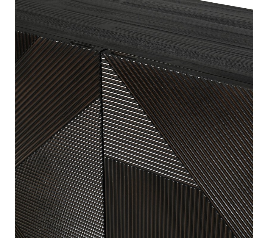 Farba je tmavohnedá až čierna, s jemným lesklým povrchom, ktorý zvýrazňuje precízne vyrezávanie na dvierkach. Geometrický vzor s jemnými lineárnymi textúrami vytvára optickú ilúziu hĺbky a pohybu, čo pridáva na vizuálnej zaujímavosti. Dvierka obsahujú dve police, ktoré poskytujú praktický úložný priestor.