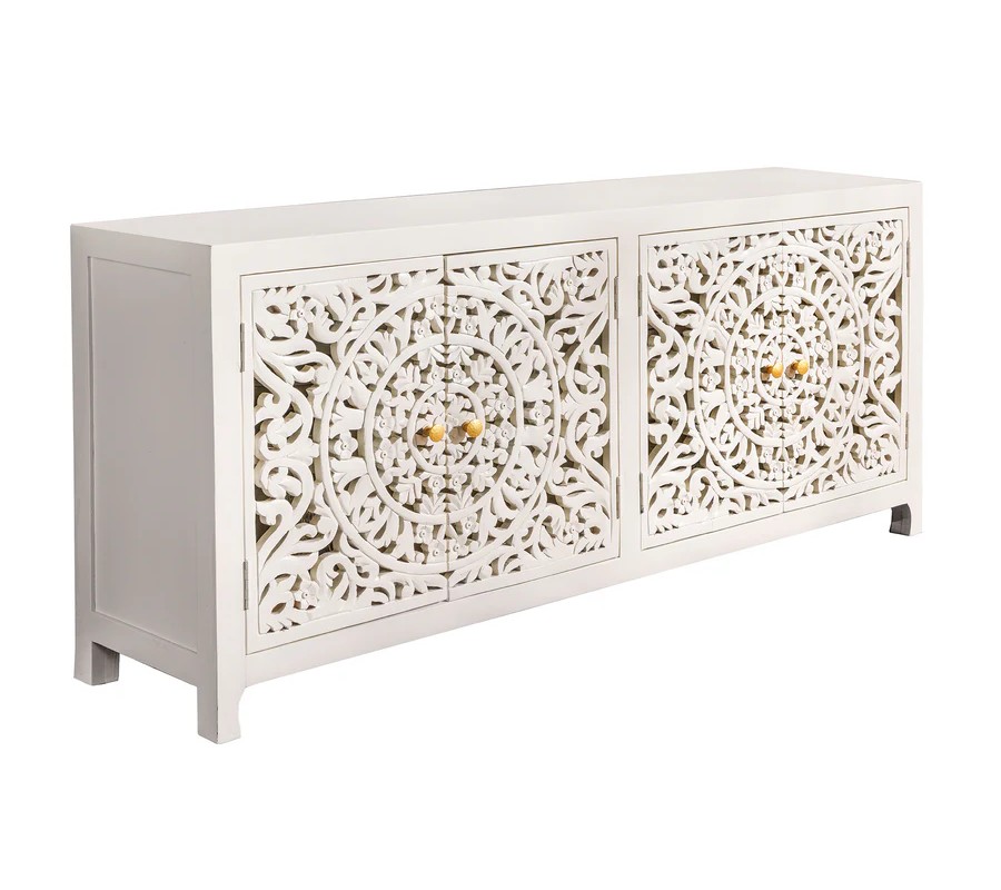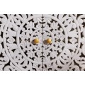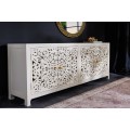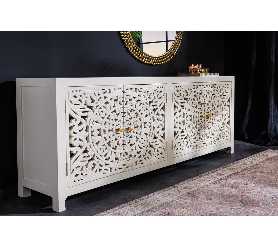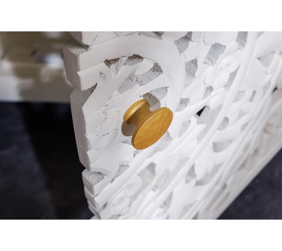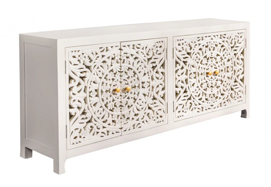 Dizajnový štvordverový orientálny príborník Orient z bieleho masívneho mangového dreva s vyrezávaním a zlatými detailmi 170 cm