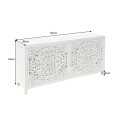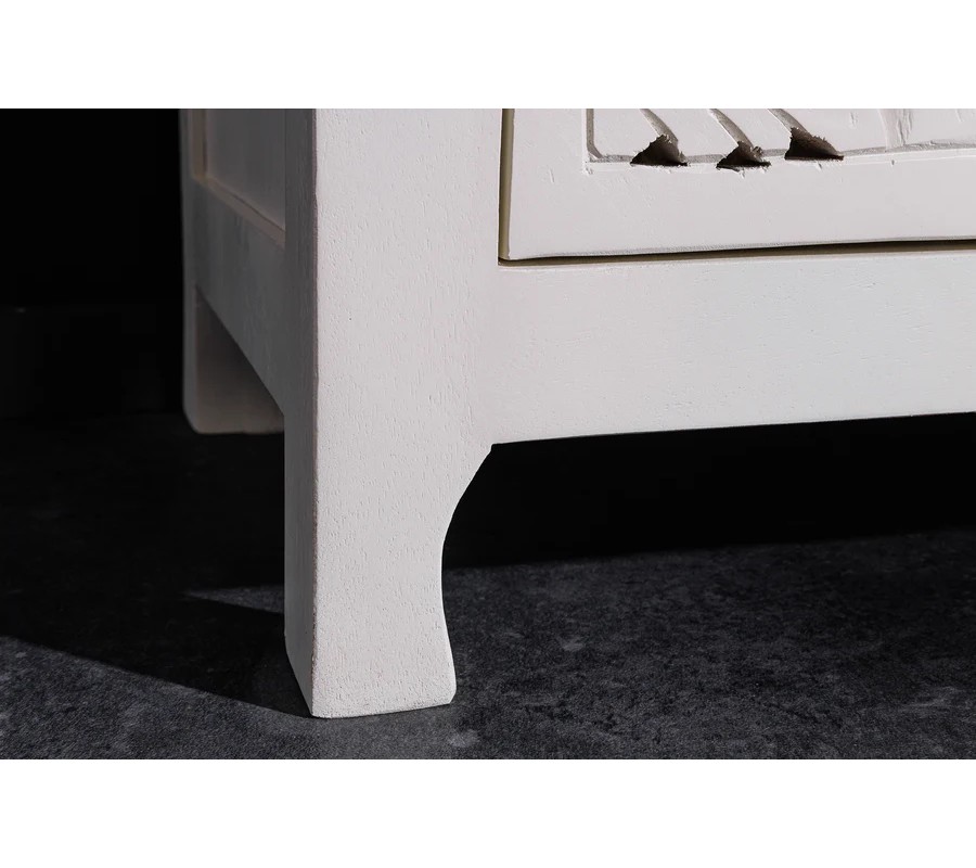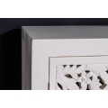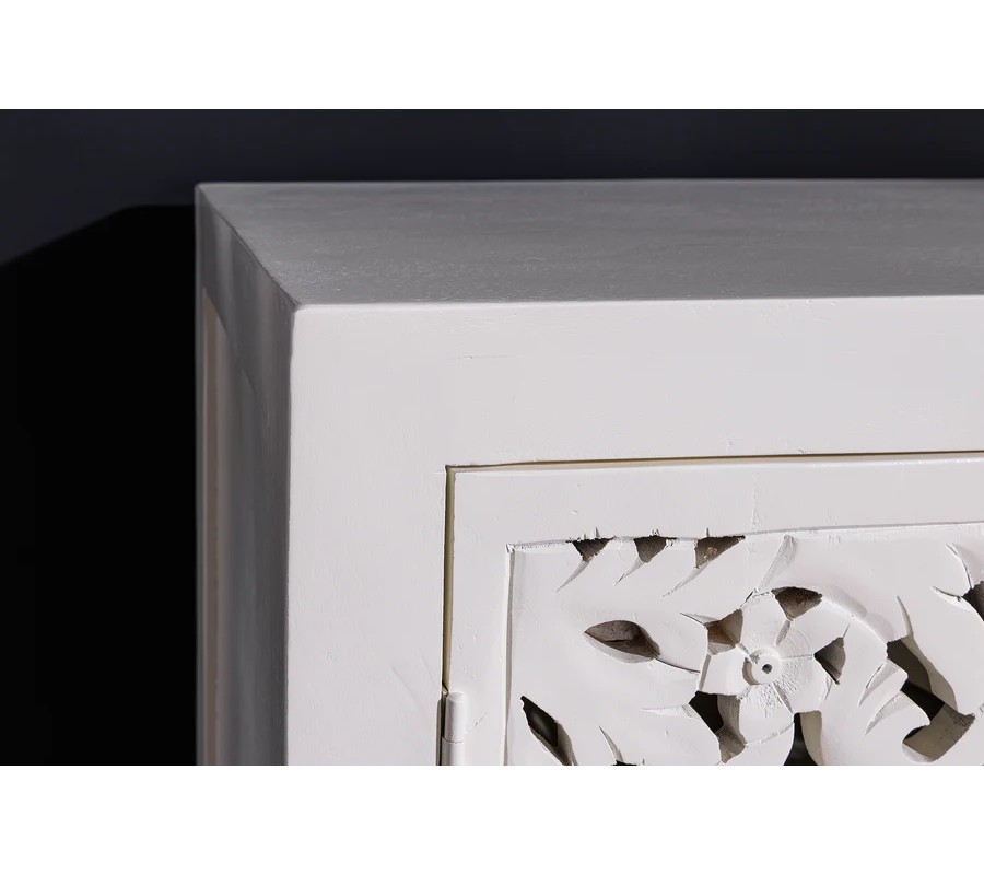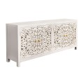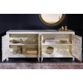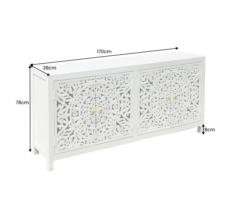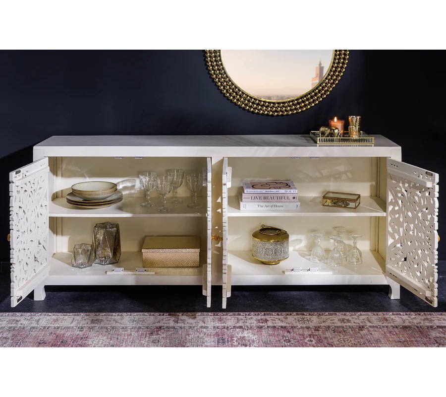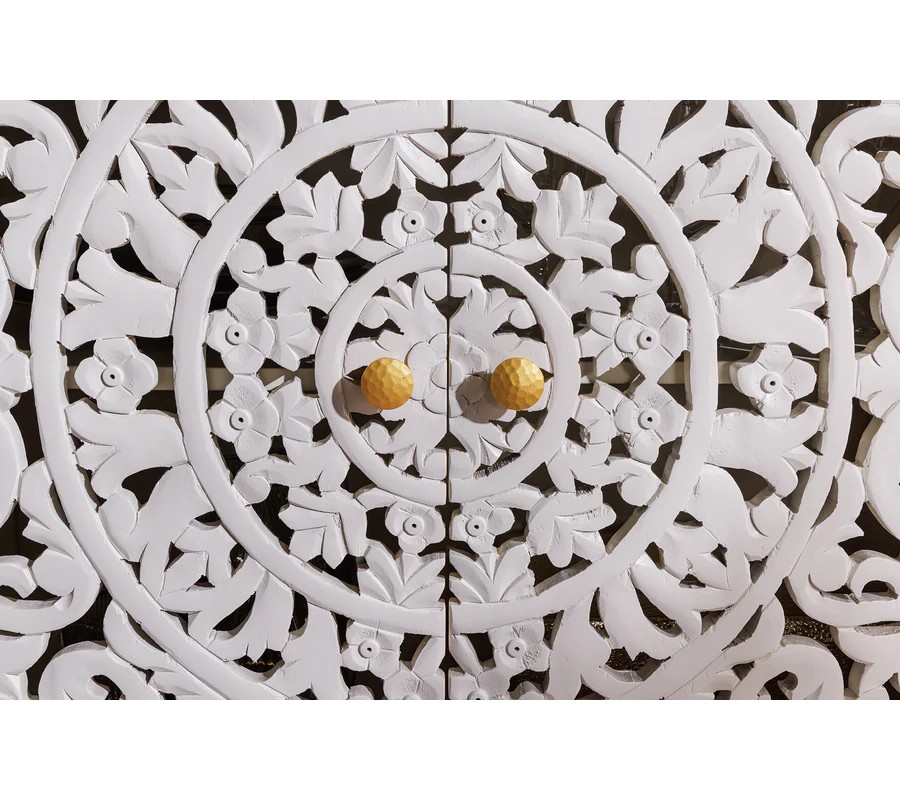 Elegantný príborník Orient má obdĺžnikový tvar a povrch v jemnom bielom odtieni, ktorý pôsobí čistým a vzdušným dojmom. Jeho najvýraznejším prvkom sú štyri bohato vyrezávané priehľadné dvierka s dekoratívnym orientálnym motívom v podobe symetrických vzorov a prepracovaných detailov, ktoré pripomínajú tradičné remeselné umenie. Vyrezávané ornamenty pripomínajú tradičné florálne motívy, typické pre zdobenie v arabských krajinách. Zlaté guľaté úchytky na dvierkach pridávajú jemný kontrast a zdôrazňujú jeho luxusný vzhľad.