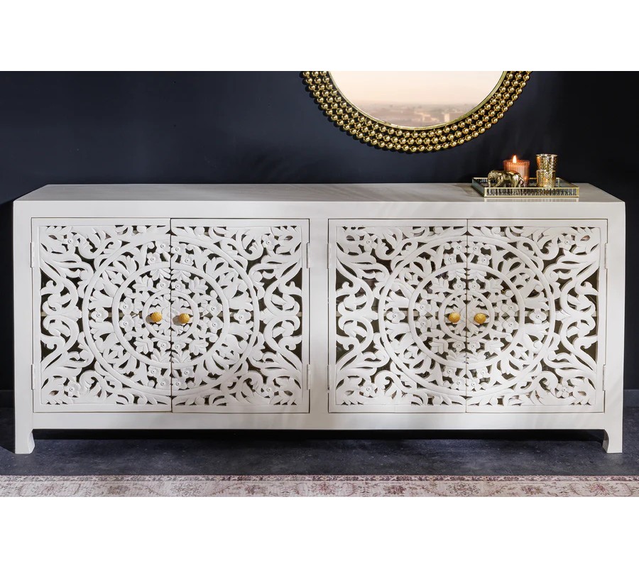 Príborník je ideálny do interiérov zariadených v štýle Provence, orientálnom, vidieckom alebo glamour, kde vynikne ako praktický aj dekoratívny prvok. Skvele sa hodí do jedálne, obývačky alebo predsiene, kde môže slúžiť na odkladanie, aj ako štýlový akcent. Perfektne sa kombinuje s nábytkom v podobných svetlých tónoch alebo s doplnkami v zlatej a krémovej farbe, ako sú vázy, svietniky alebo zrkadlá. Jeho zdobený dizajn oživí priestor a pridá mu šarm a osobitý charakter.