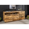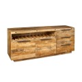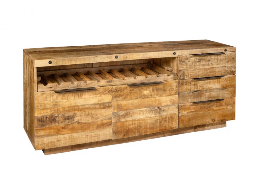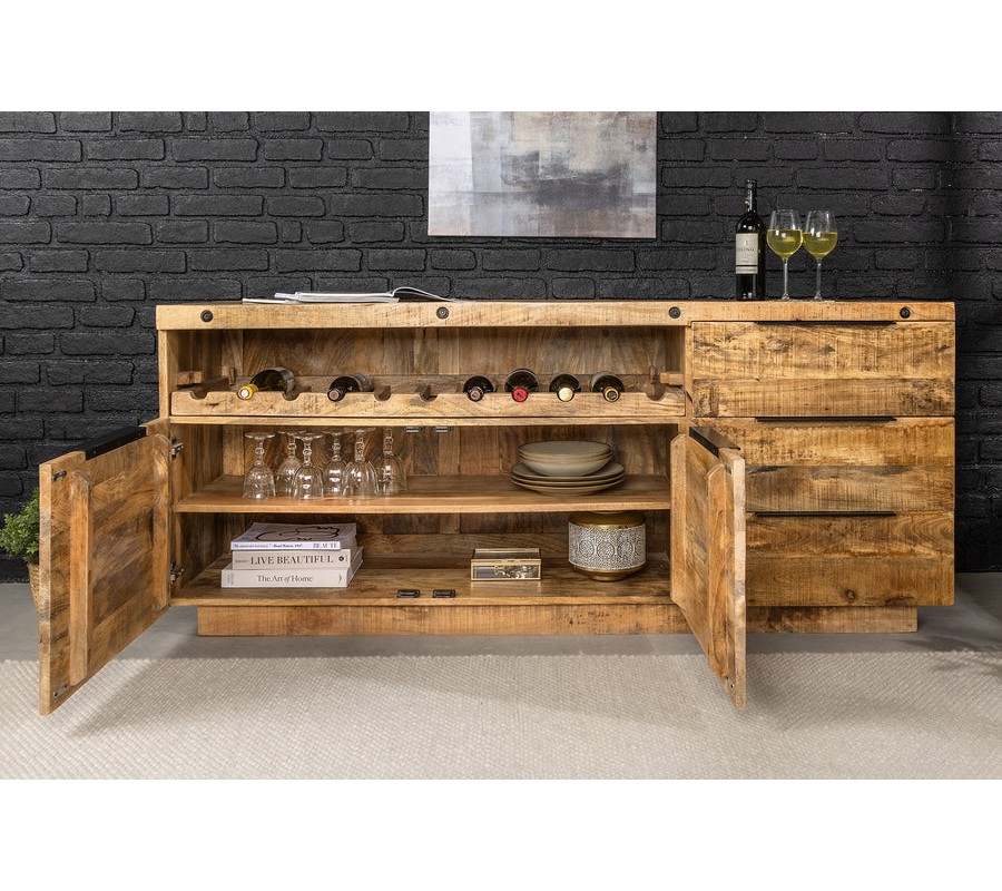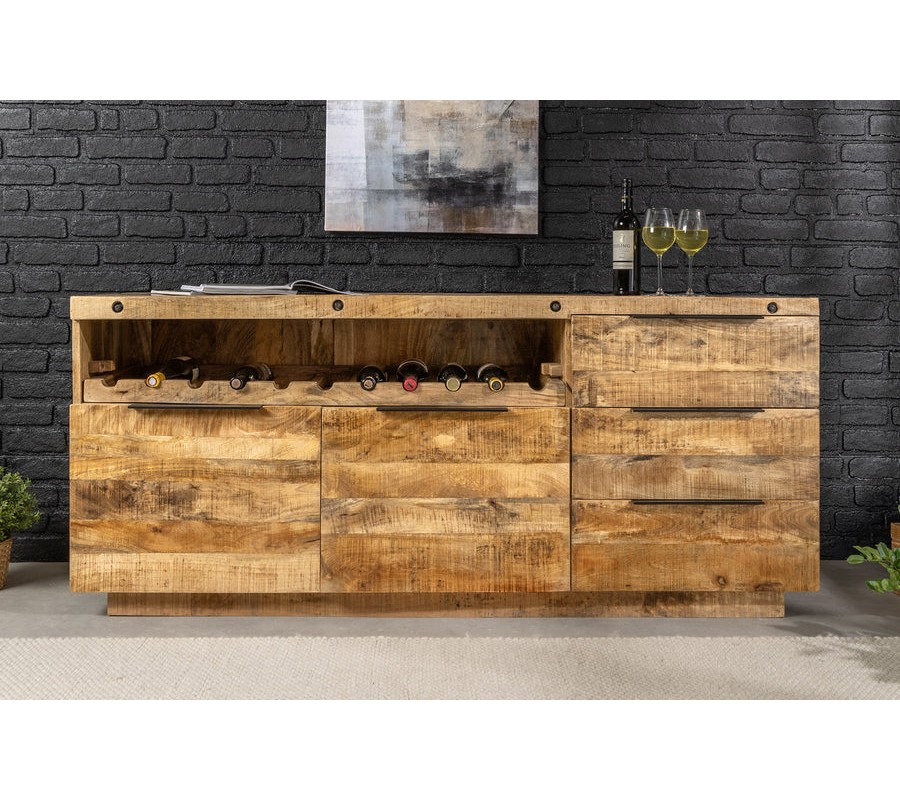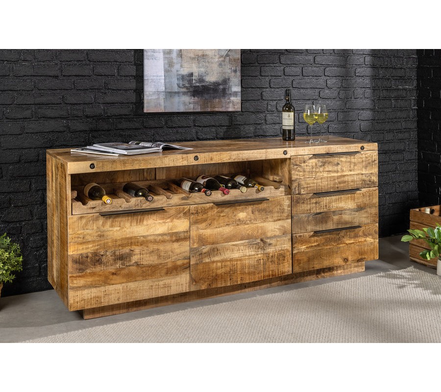 Dizajnový dvojdverový hnedý industriálny masívny príborník Steele Craft z masívneho mangvého dreva s poličkou na víno 175 cm