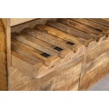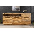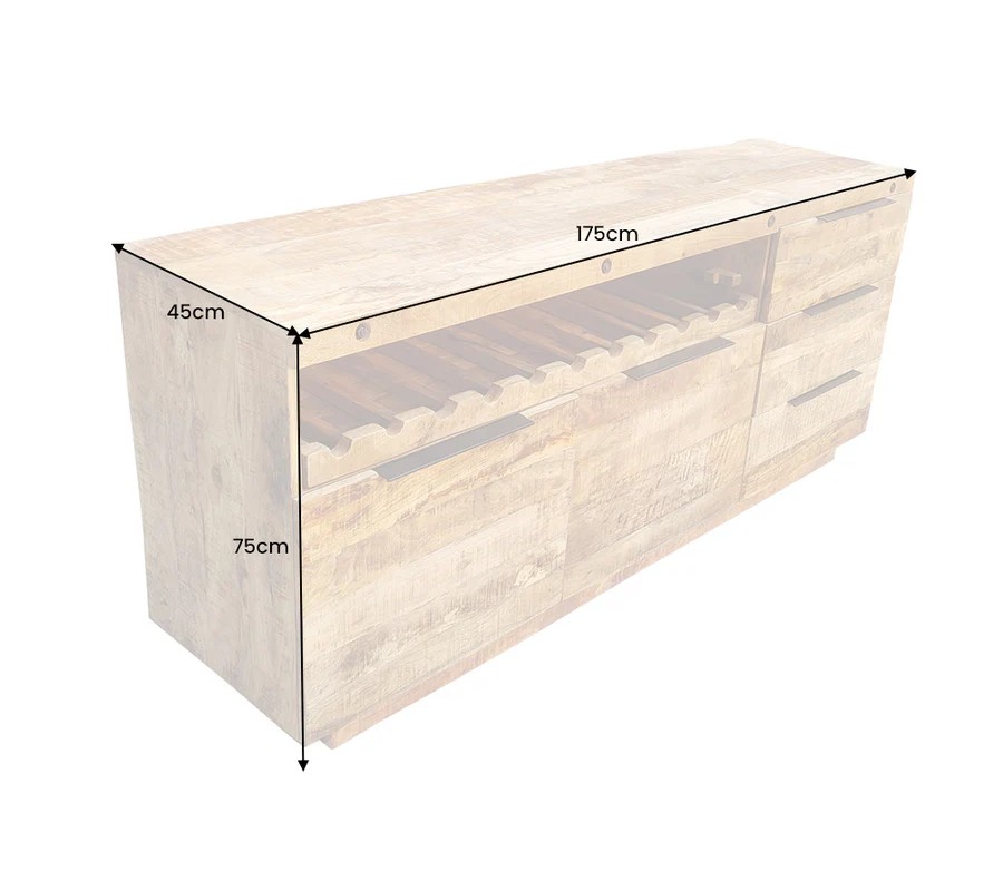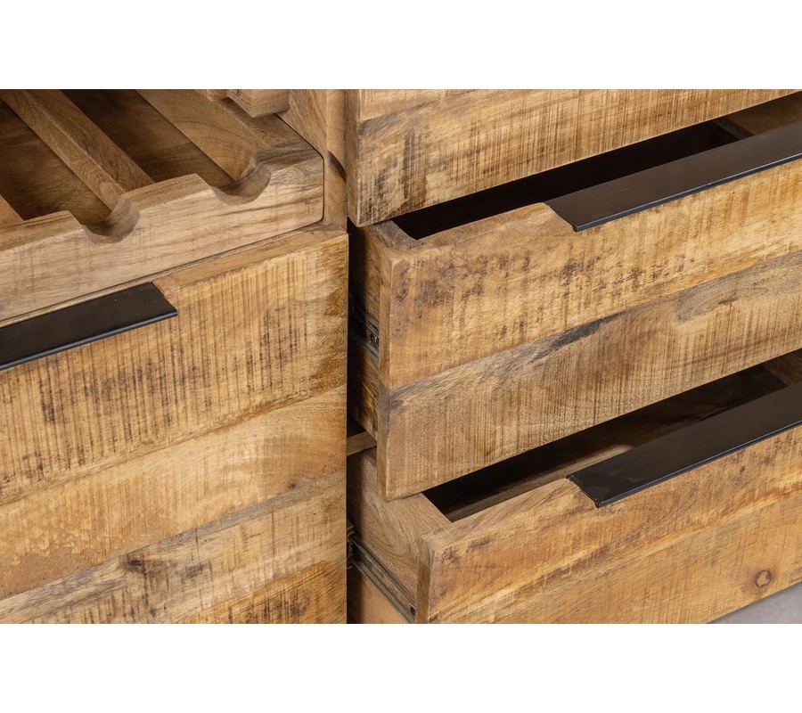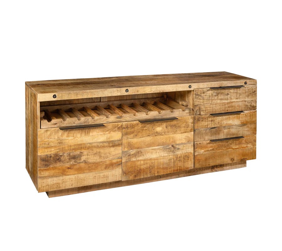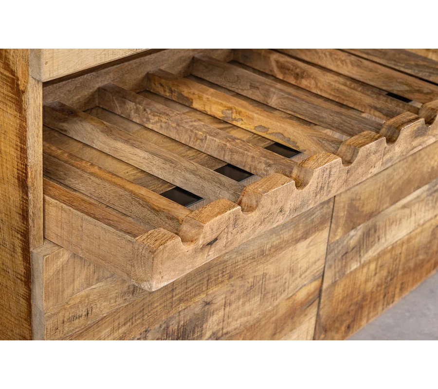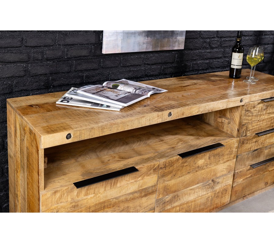 Príborník Steele Craft má robustný obdĺžnikový tvar, ktorý vyniká svojím prírodným vzhľadom a funkčným dizajnom. Je vyrobený z masívneho mangového dreva s teplou medovo hnedou farbou a výraznou textúrou, ktorá zachováva prírodnú štruktúru dreva. Povrch je hladký, s autentickým charakterom.