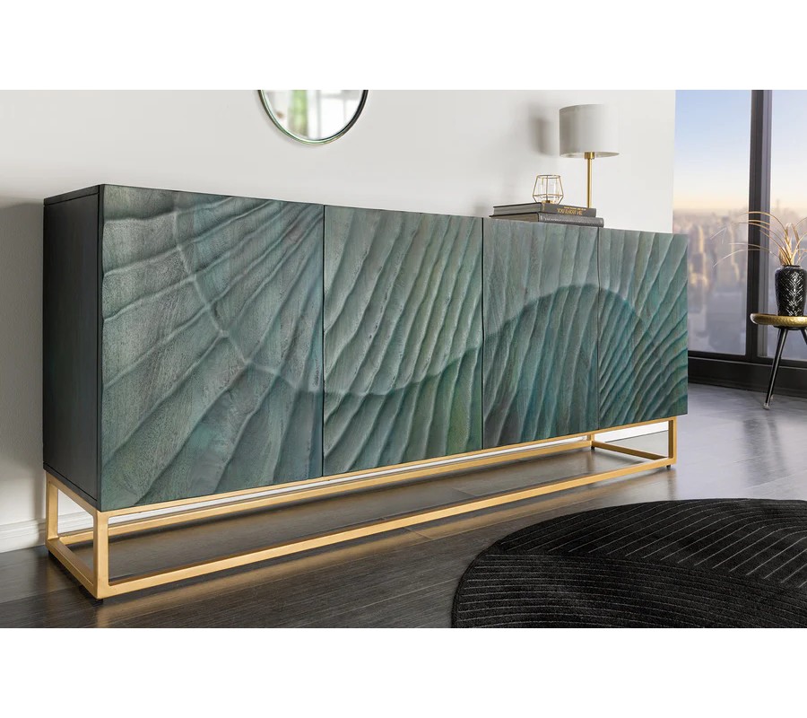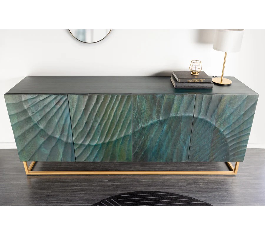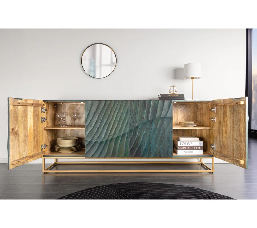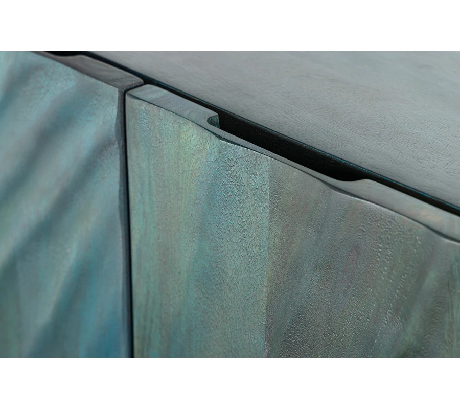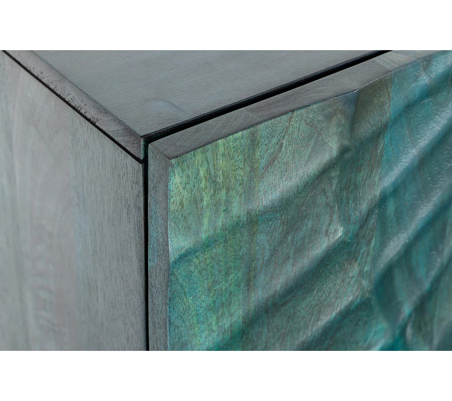 Štvordverový štýlový príborník Cumbria s moderným dizajnom má elegantný obdĺžnikový tvar a povrch zdobený jemným vyrezávaním pripomínajúcim vlny, ktoré vytvárajú dojem pohybu. Povrch dvierok z masívneho mangového dreva je upravený do odtieňov zelenej a modrej s prirodzenou štruktúrou dreva, čo dodáva výrazný vizuálny efekt. Dvierka sú štyri a skrývajú dve vnútorné časti s dvoma poličkami, ktoré poskytujú dostatok úložného priestoru.