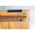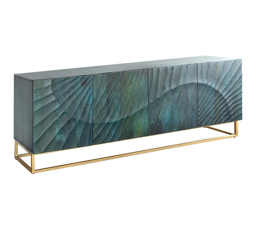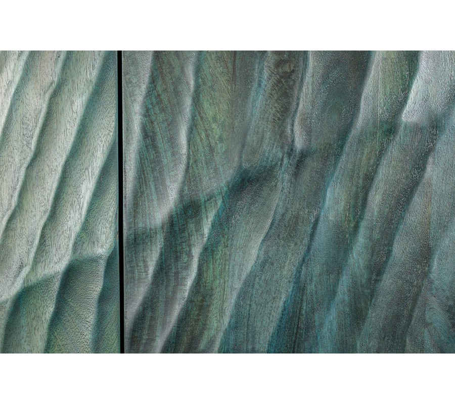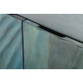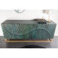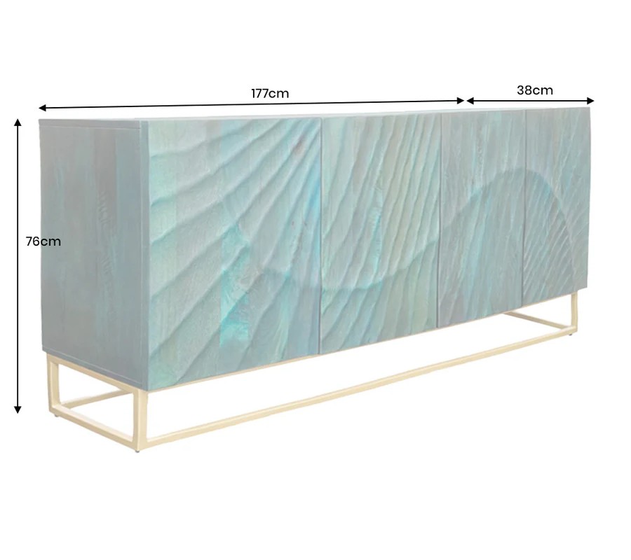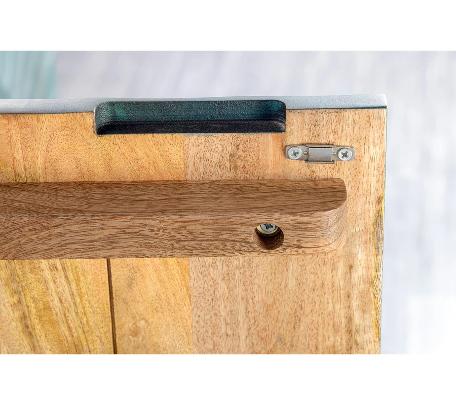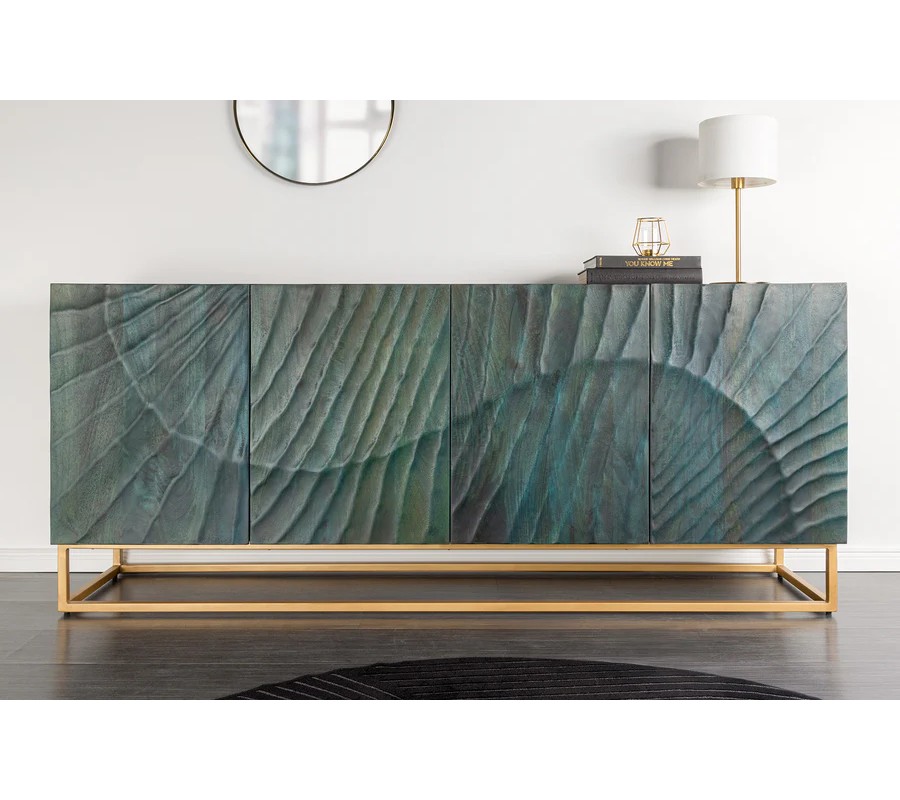 Štvordverový štýlový príborník Cumbria s moderným dizajnom má elegantný obdĺžnikový tvar a povrch zdobený jemným vyrezávaním pripomínajúcim vlny, ktoré vytvárajú dojem pohybu. Povrch dvierok z masívneho mangového dreva je upravený do odtieňov zelenej a modrej s prirodzenou štruktúrou dreva, čo dodáva výrazný vizuálny efekt. Dvierka sú štyri a skrývajú dve vnútorné časti s dvoma poličkami, ktoré poskytujú dostatok úložného priestoru.