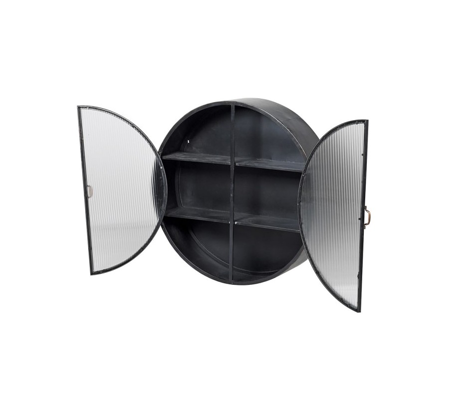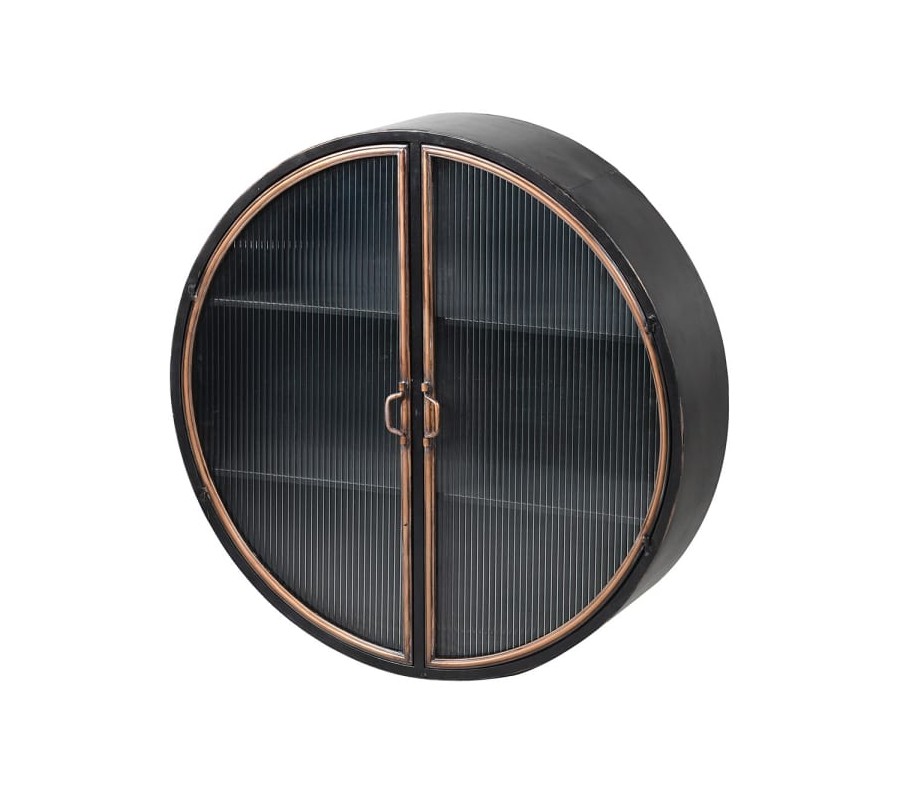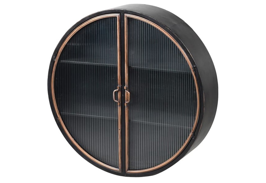 Nástenná skrinka Usil je výrazným doplnkom v modernom industriálnom štýle. Má okrúhly tvar, ktorý pôsobí netradične a štýlovo. Skrinka je dvojdverová, pričom dvierka sú vyrobené z rebrovaného skla, čo pridáva na elegancii a zároveň umožňuje jemný pohľad na obsah skrinky bez úplného odkrytia. Kovový rám dvierok má zlaté detaily, ktoré sú precízne spracované a vytvárajú kontrast so základnou čiernou farbou celej konštrukcie.
