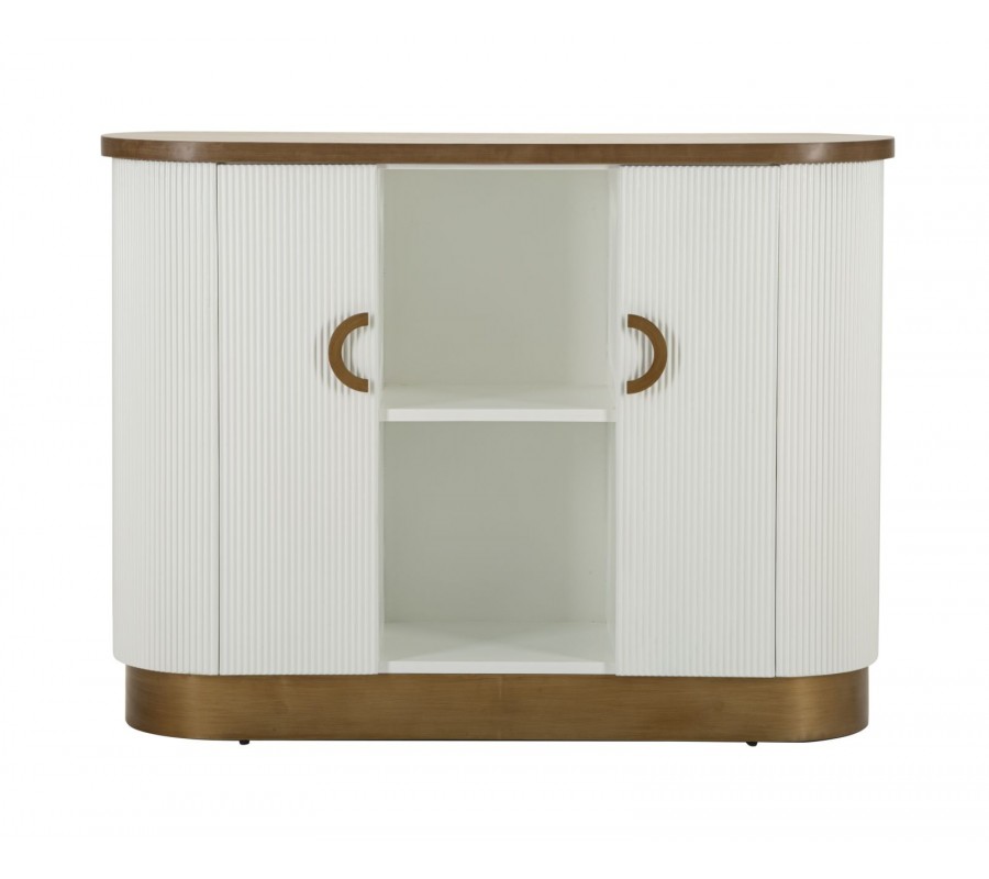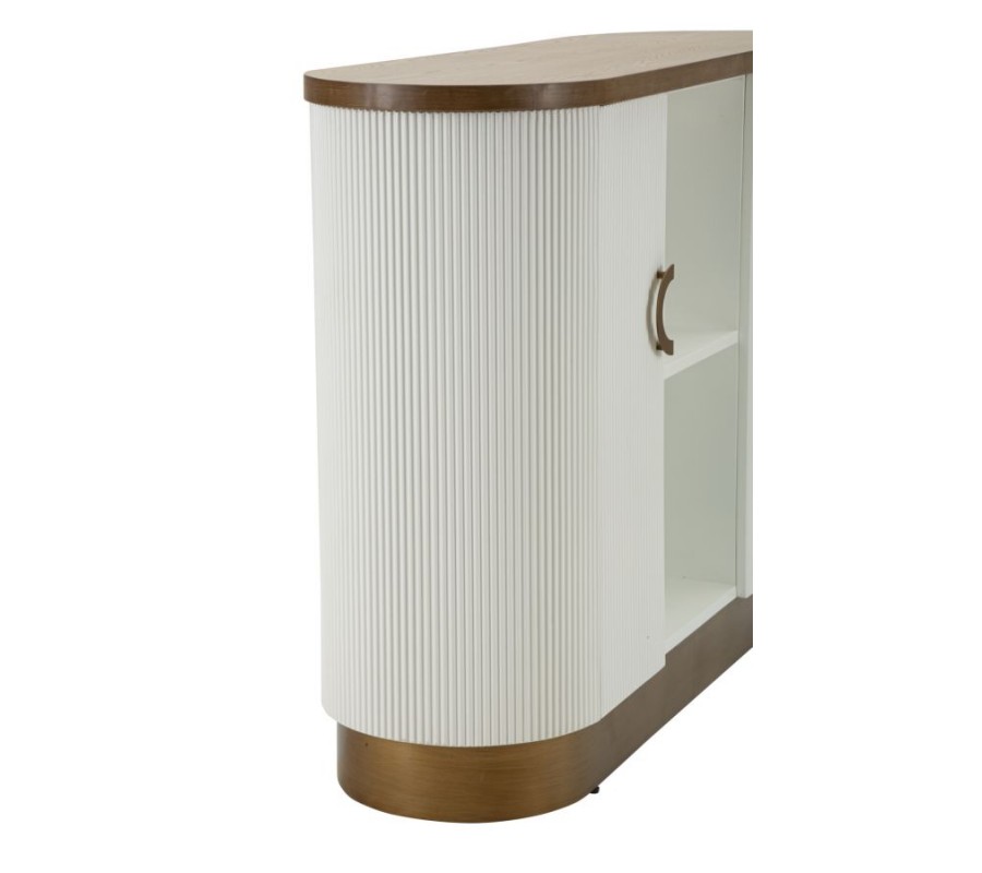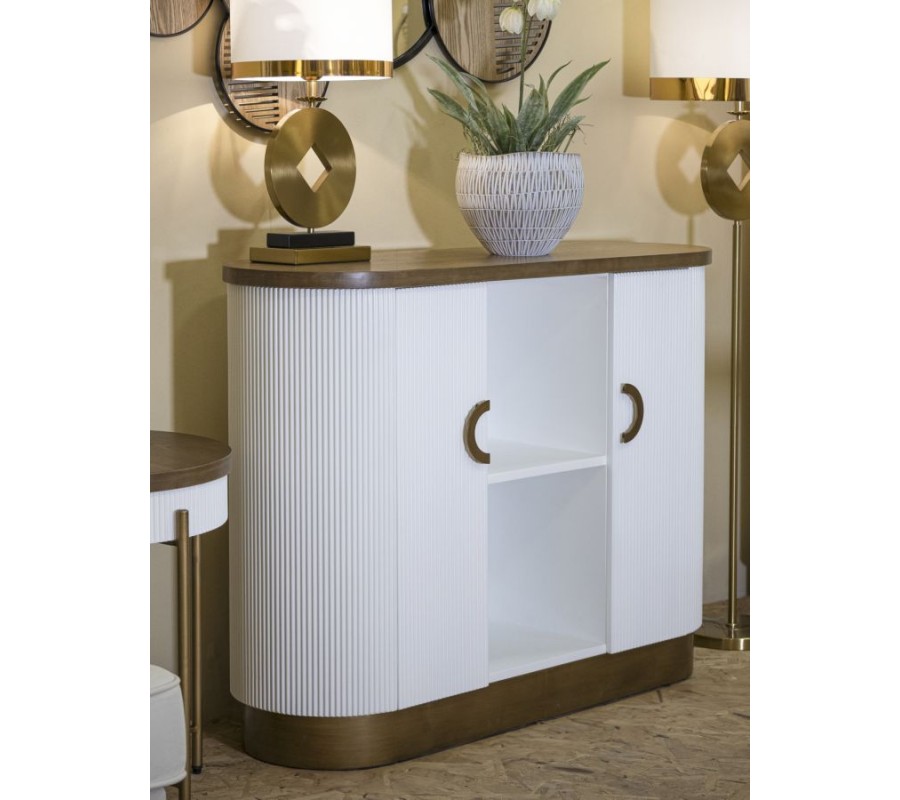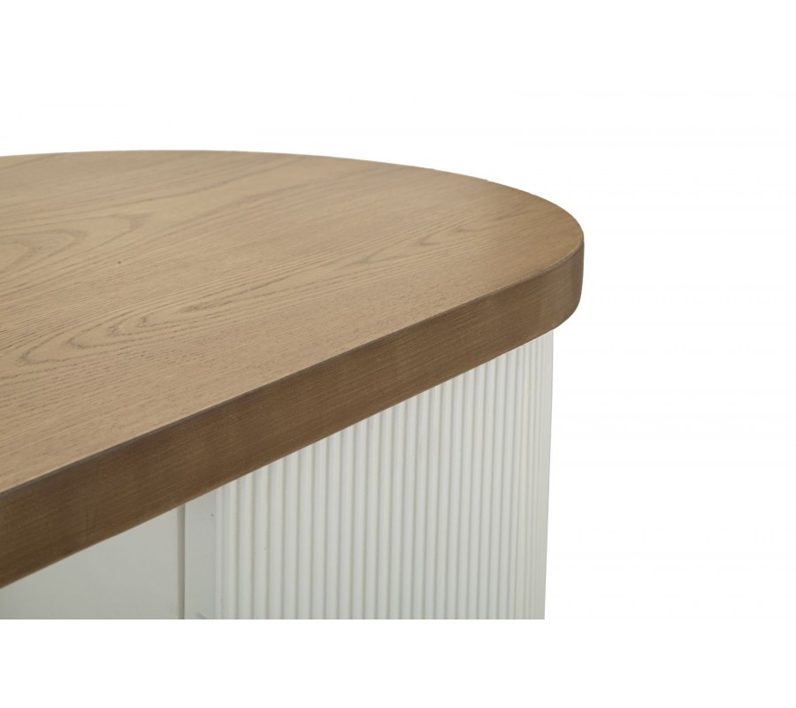 Art deco dvojdvierkový oválny konzolový stolík Glamia Blanc s hnedou doskou a bielým vrúbkovaným korpusom 121 cm