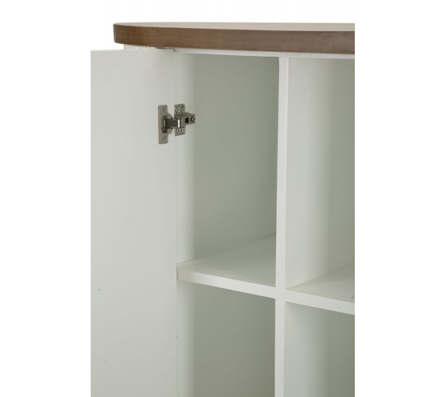 V spodnej časti nábytku nájdete kovovú podstavu v zlato bronzovom vyhotovení, ladne kopírujúcu oblé línie stolíka. Vpredu sa nachádzajú dvoje dvierka s kovovými úchytkami v rovnakom zlato bronzovom odtieni. Po ich otvorení objavíte vnútorný úložný priestor s dvomi policami, a jedna je otvorená a viditeľná uprostred, poskytujúca priestor napríklad na vystavenie dekorácií.