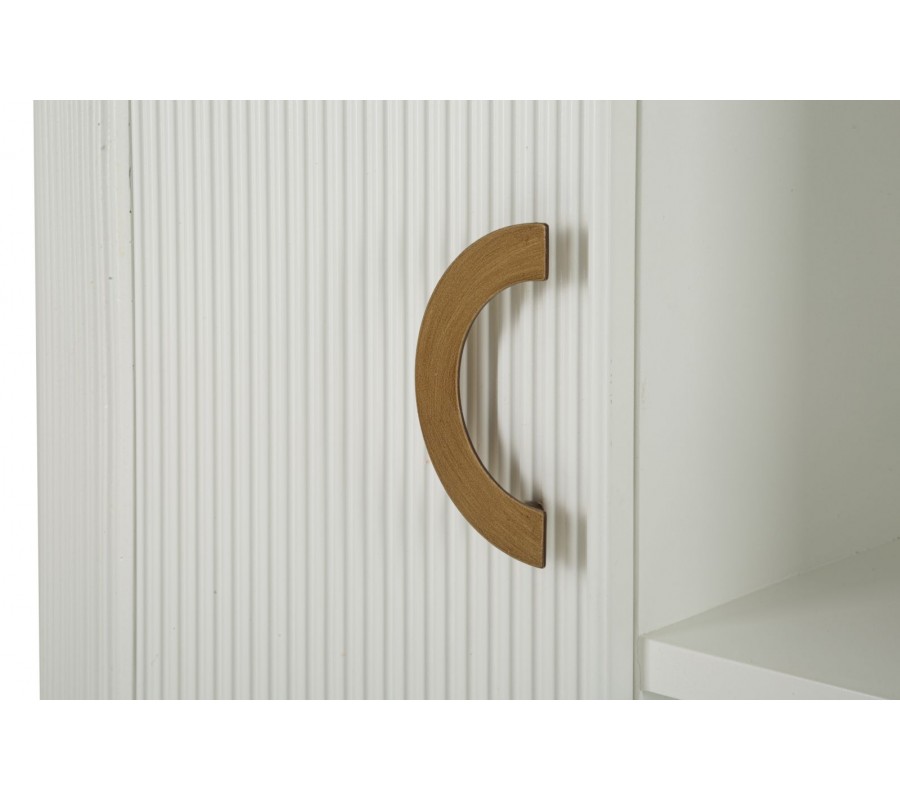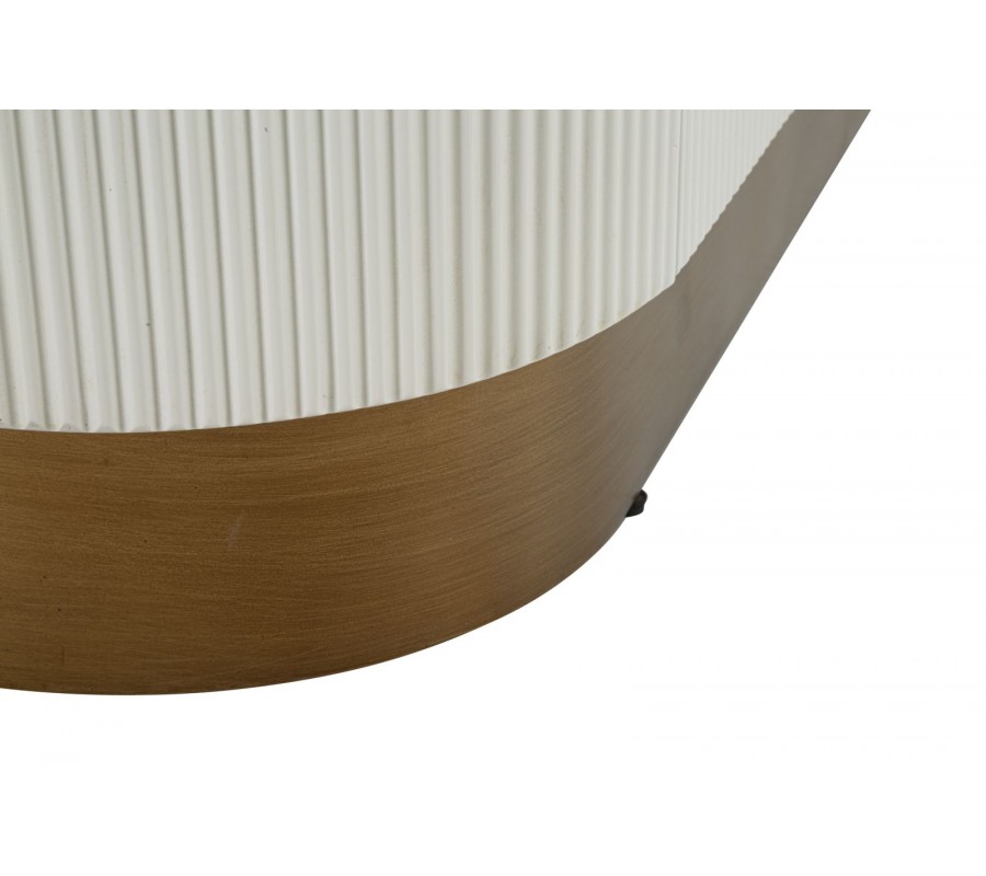 Konzolový stolík Glamia Blanc má oválny tvar v súlade s art deco a glamour štýlom. Korpus je vyrobený z laminátu s vrúbkovanou povrchovou úpravou v jemne bielej farbe. V hornej časti sa nachádza oválna doska z jaseňového dreva, ktorá má prirodzene hnedý teplý odtieň a jemne viditeľnú kresbu. Povrch je hladký, vďaka čomu krásne kontrastuje s rebrovanými bokmi stolíka.