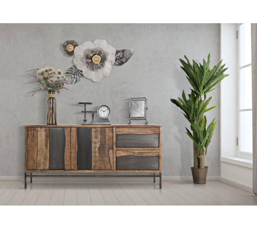 Tento príborník sa dokonale hodí do industriálnych, loftových či moderných interiérov, kde vynikne ako praktický a dizajnový prvok v jedálni, obývačke alebo kuchyni. Skvele sa kombinuje s masívnym dreveným nábytkom, kovovými akcentmi a surovými materiálmi ako betón či tehla. Doplnia ho svietidlá s kovovým rámom, keramické dekorácie v neutrálnych odtieňoch a jedálenský stôl v podobnom materiálovom vyhotovení, ktoré podčiarknu jeho industriálny vzhľad.