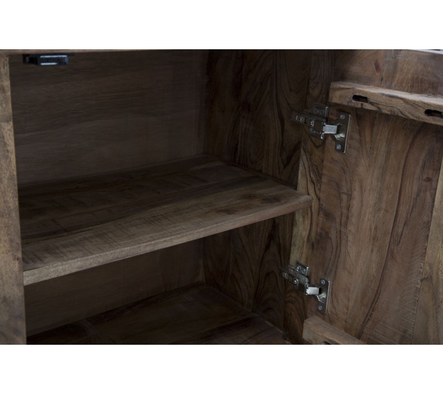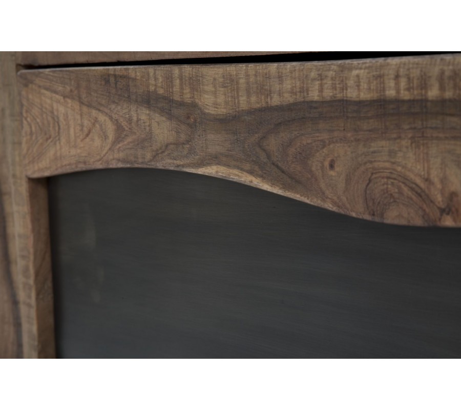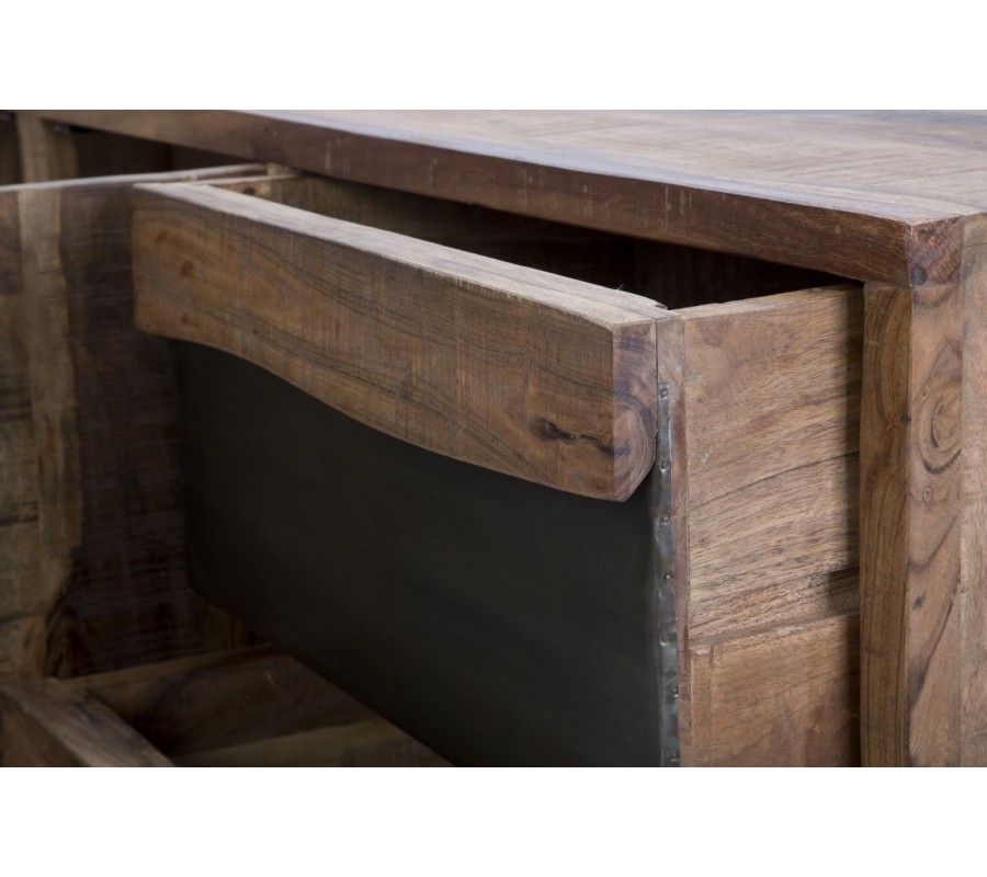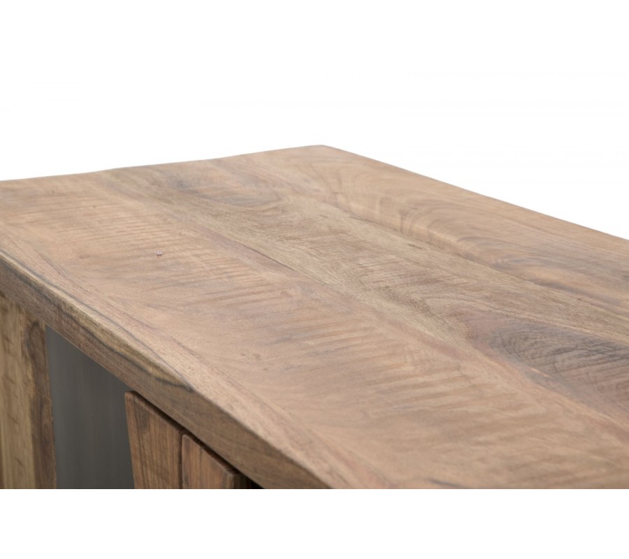 Industriálny dvojdverový príborník Berignone z masívneho akáciového dreva kombinuje prírodný materiál s modernými prvkami a ponúka praktický úložný priestor. Svetlohnedé drevo s výraznou prirodzenou kresbou zvýrazňuje autentický vzhľad, zatiaľ čo kovové nožičky v surovom industriálnom prevedení dodávajú robustnosť a vzdušnosť.