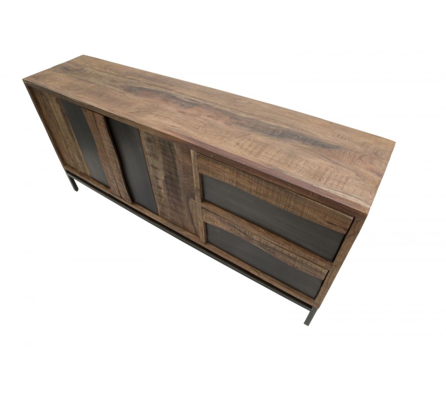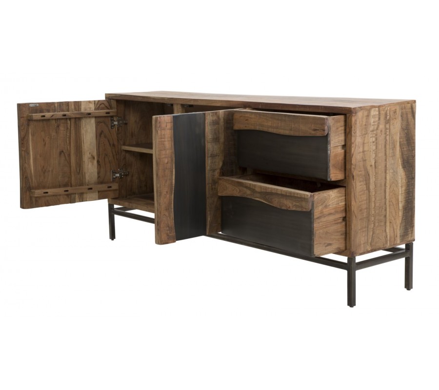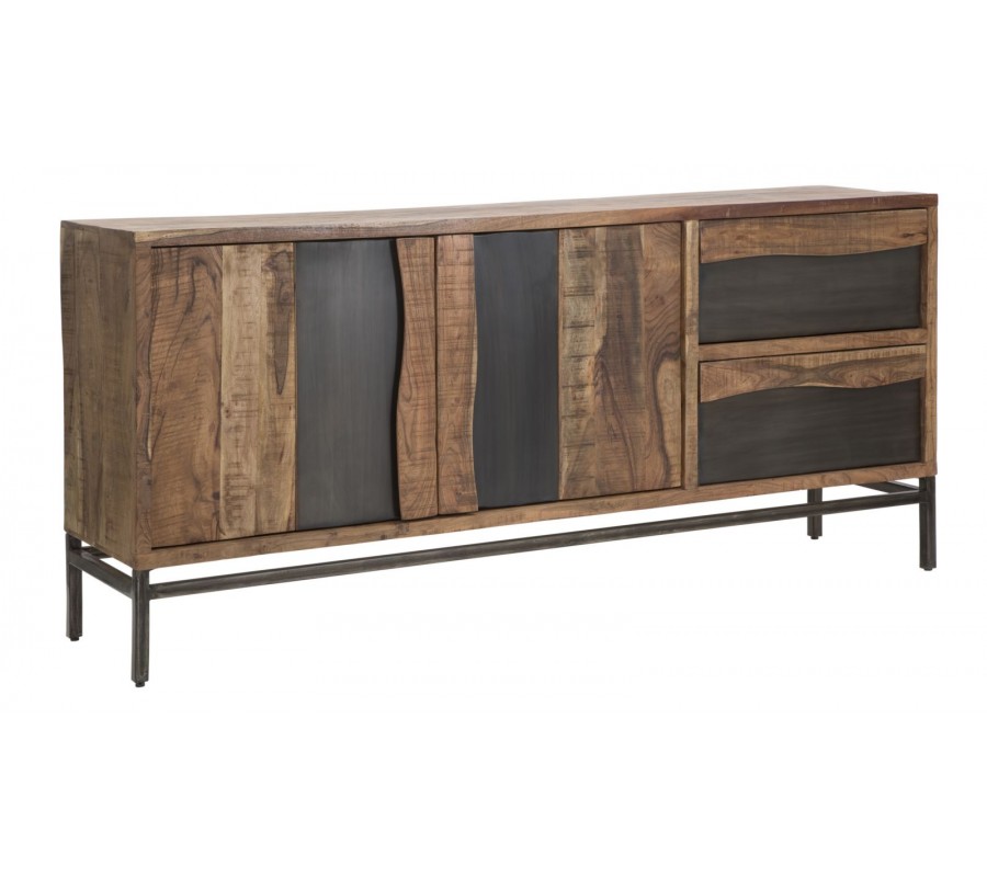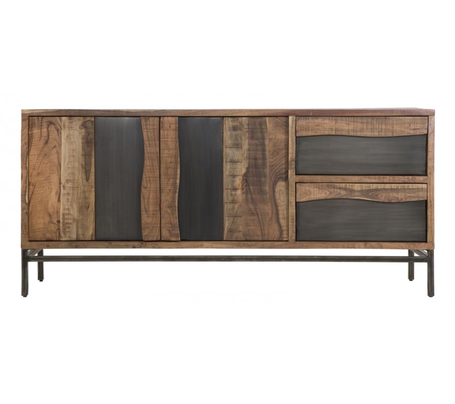 Industriálny obdĺžnikový hnedý masívny dvojdverový príborník Berignone s dvomi zásuvkami s kovovými nožičkami 175 cm