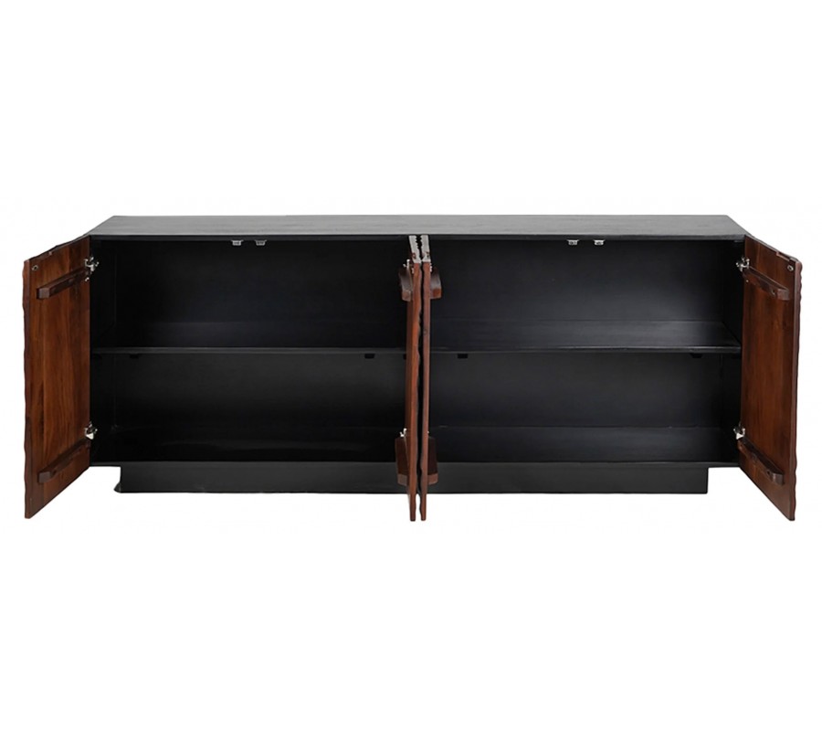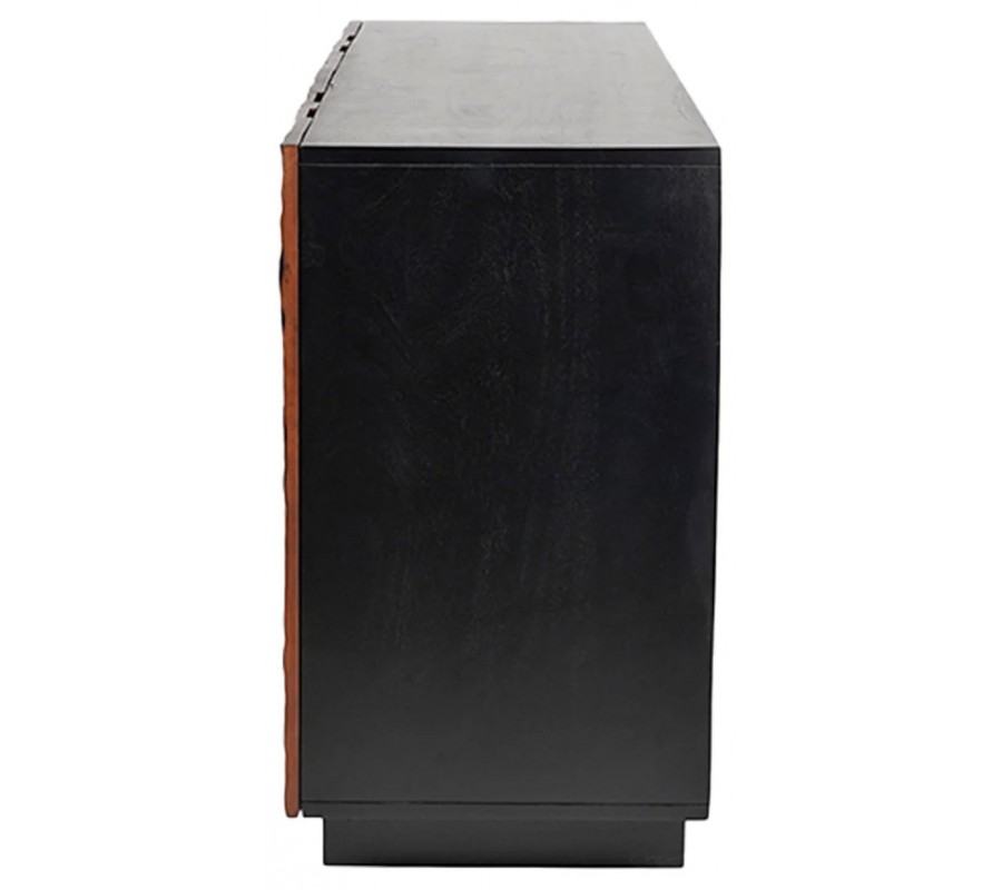 Stabilitu príborníka zabezpečuje jeho čierny blokový podstavec, ktorý dotvára elegantný vzhľad a zároveň zvyšuje odolnosť konštrukcie. Kombinácia teplej hnedej farby dreva a čierneho korpusu vytvára harmonický kontrast, ktorý skvele zapadne do moderných, industriálnych aj prírodne ladených interiérov.