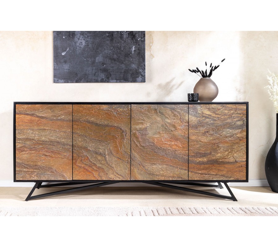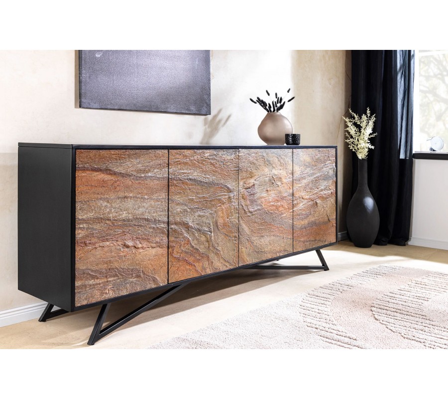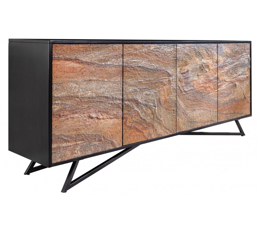 Dizajnový čierny obdĺžnikový príborník Ravelo s kamennou dyhou v hnedých a sivých tónoch s čiernou kovovou podstavou 175 cm