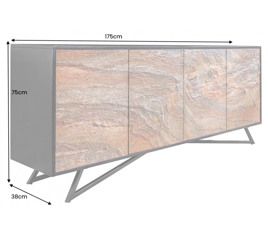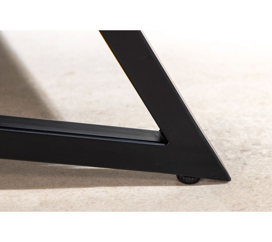 Podstavu tvorí čierna kovová konštrukcia s prekríženým geometrickým dizajnom, ktorá príborníku dodáva moderný a vzdušný vzhľad. Jemne naklonené kovové línie zaisťujú stabilitu a zároveň podčiarkujú industriálny charakter nábytku.