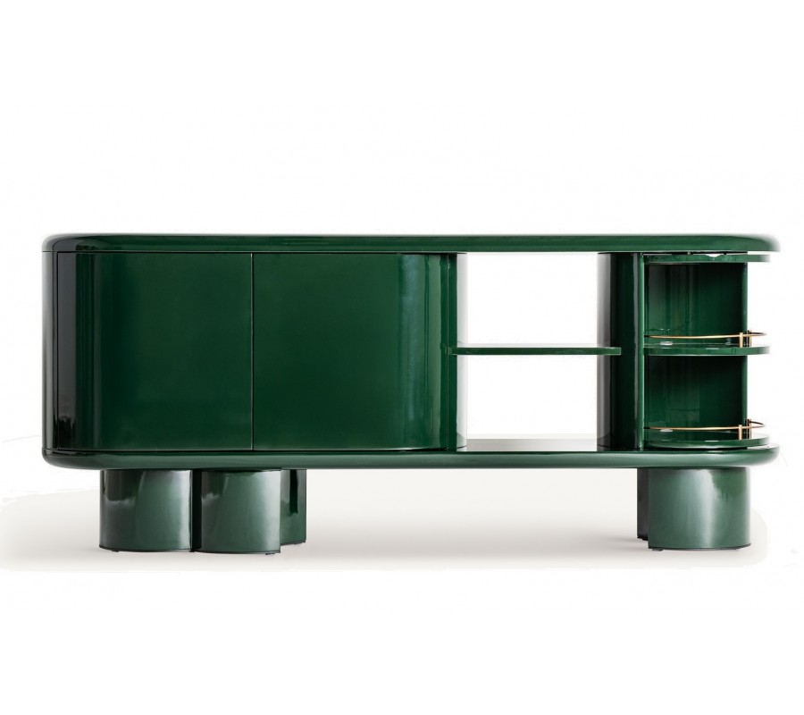Luxusný oválny art deco príborník Velora v tmavozelenej farbe s úložným priestorom s dvierkami so zlatými detailmi 180 cm