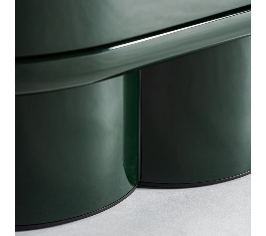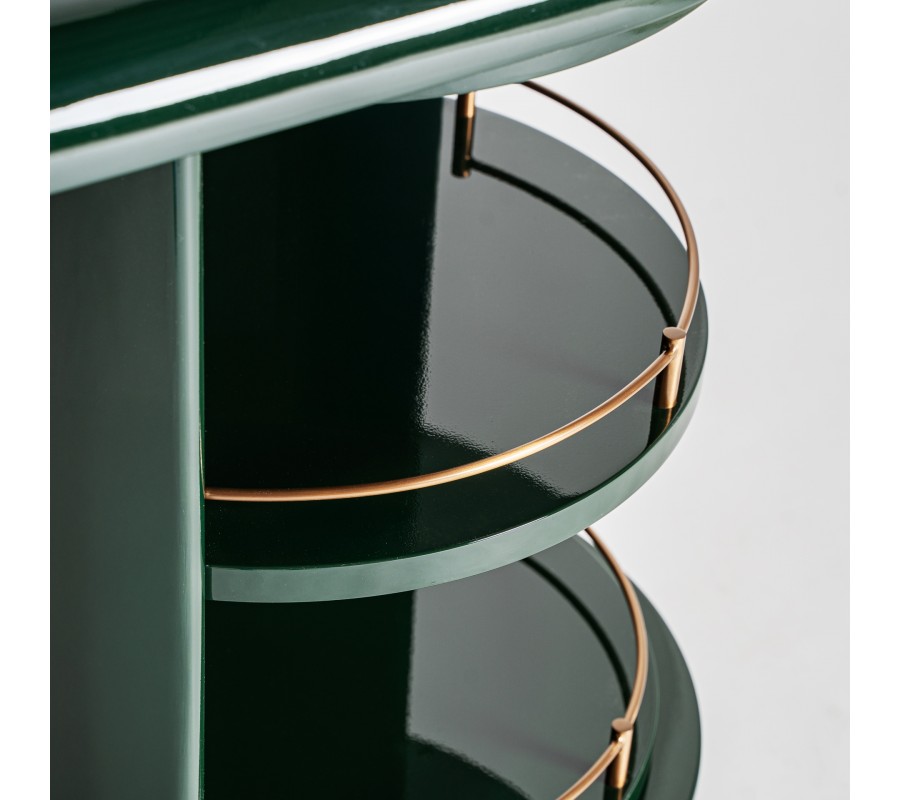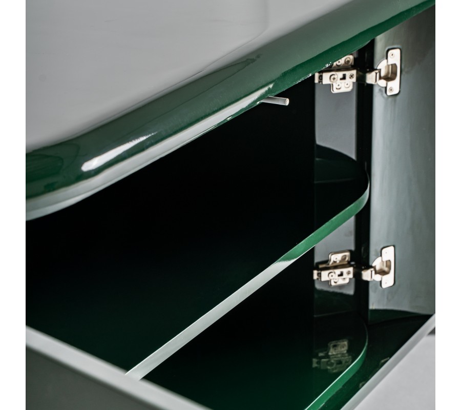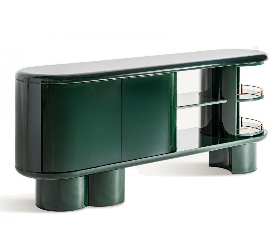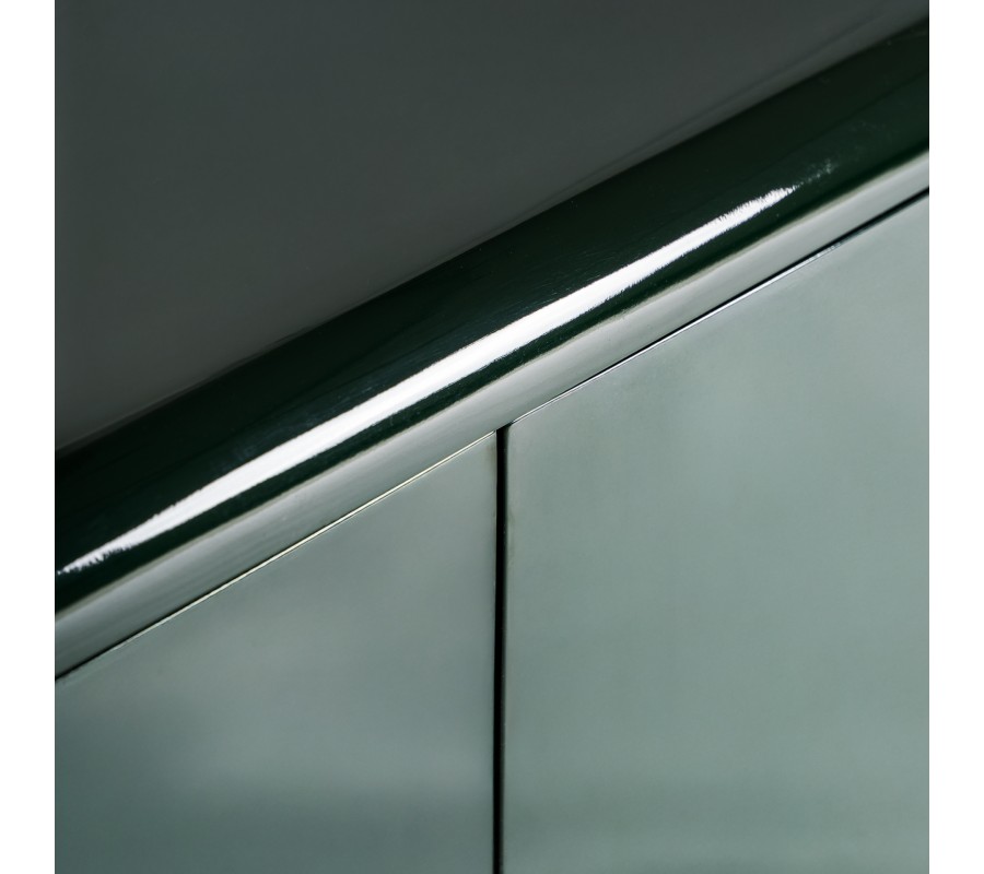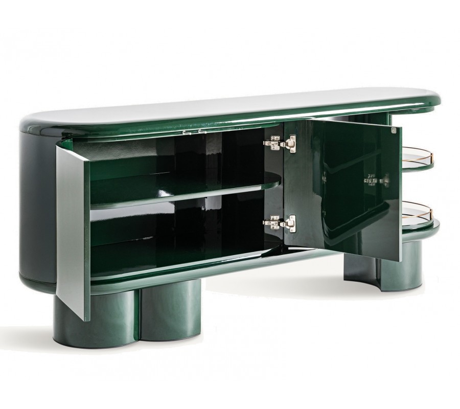 Príborník Velora v sebe spája precízne remeselné spracovanie s elegantným art deco dizajnom a nápadité prvky glamour štýlu. Zaoblená konštrukcia z dreva v smaragdovej zelenej farbe s lesklou povrchovou úpravou vytvára dojem sofistikovaného luxusu.