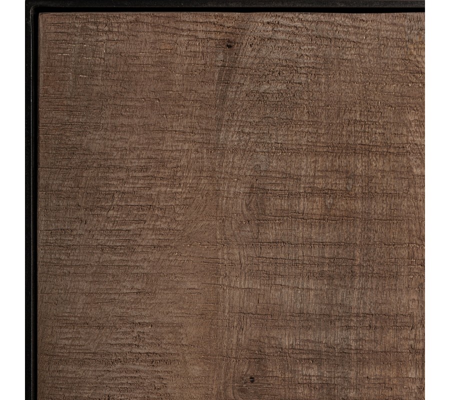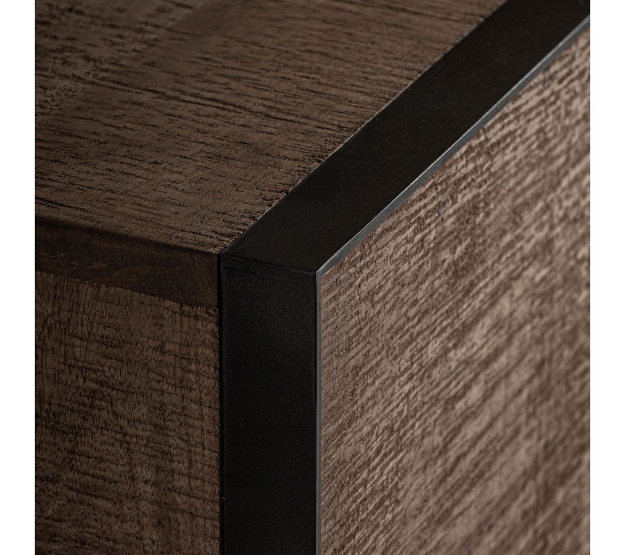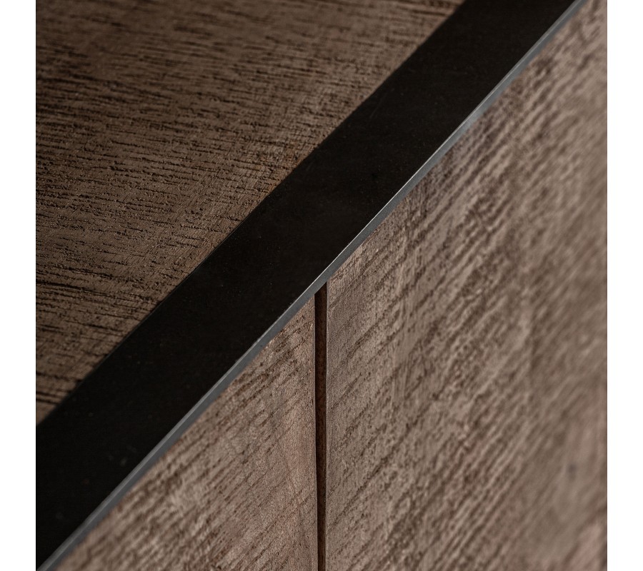 Luxusný masívny príborník Salinia v obdĺžnikovom tvare je spojením prírodnej krásy dreva a industriálnej robustnosti kovu. Korpus z čierneho kovu dodáva nábytku stabilitu a moderný kontrast k teplým odtieňom masívneho mangového dreva, ktoré tvorí prednú časť so štyrmi dvierkami. Drevené dvierka majú jemnú prírodnú štruktúru letokruhov, vďaka čomu pôsobia autenticky a prirodzene.