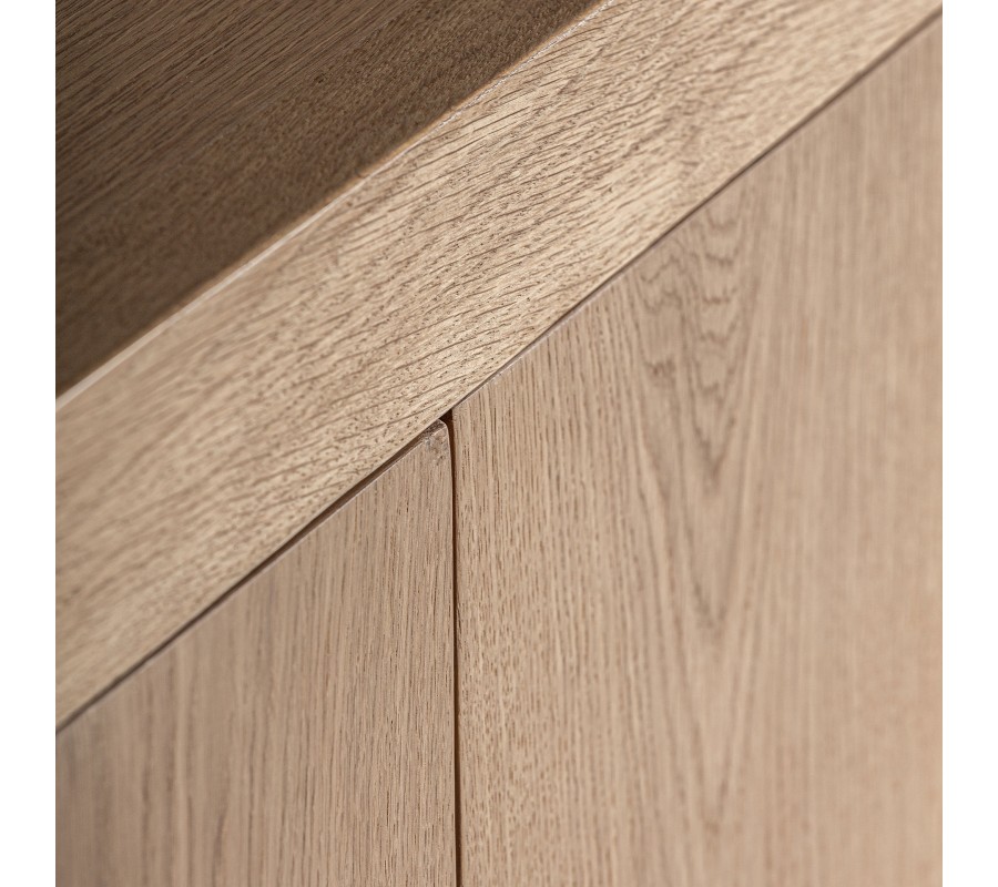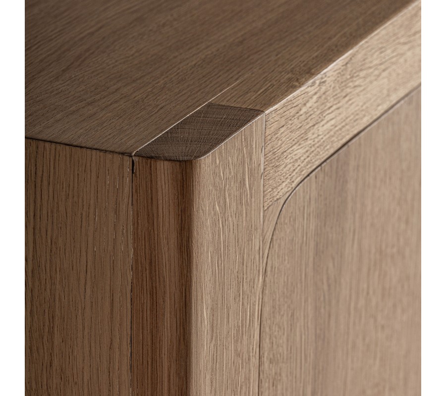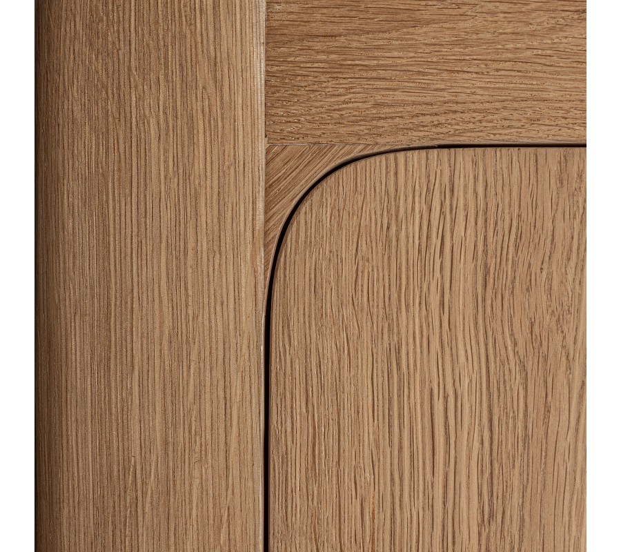 Luxusný moderný päťdvierkový dubový masívny príborník Oakis v svetlej hnedej farbe prináša elegantné riešenie úložného priestoru v nadčasovom dizajne. Jeho čisté línie a jemne zaoblené hrany rámu pôsobia moderne a zároveň zachovávajú prírodný charakter vďaka výraznej štruktúre letokruhov na povrchu dreva. Vyznačuje sa symetrickým usporiadaním, na ľavej aj pravej strane sa nachádzajú rovnako veľké dvojdverové skrinky, z ktorých každá obsahuje dve poličky. Stredová skrinka má menšie rozmery a tiež disponuje dvomi poličkami, ktoré sú uložené tak, že horná poskytuje menší priestor než spodná, ideálne pre kombináciu rôznych typov úložných predmetov.
