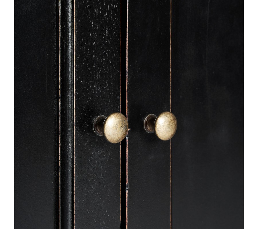 Luxusný vintage príborník Zena Noir v elegantnej čiernej farbe je vytvorený z masívneho mangového dreva a vyniká svojím obdĺžnikovým tvarom a robustnou siluetou. V prednej časti má tri dvierka a štyri zásuvky, pričom každá skrinka obsahuje jednu praktickú poličku. Ľavá skrinka má dvoje dvierka, zatiaľ čo pravá je vybavená jednými dvierkami, čo vytvára harmonickú rovnováhu medzi symetriou a funkčnosťou.