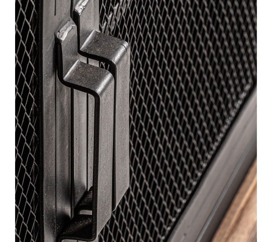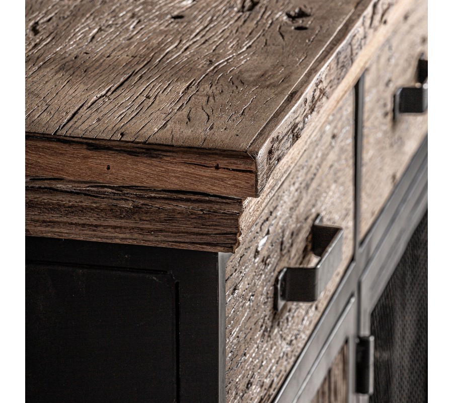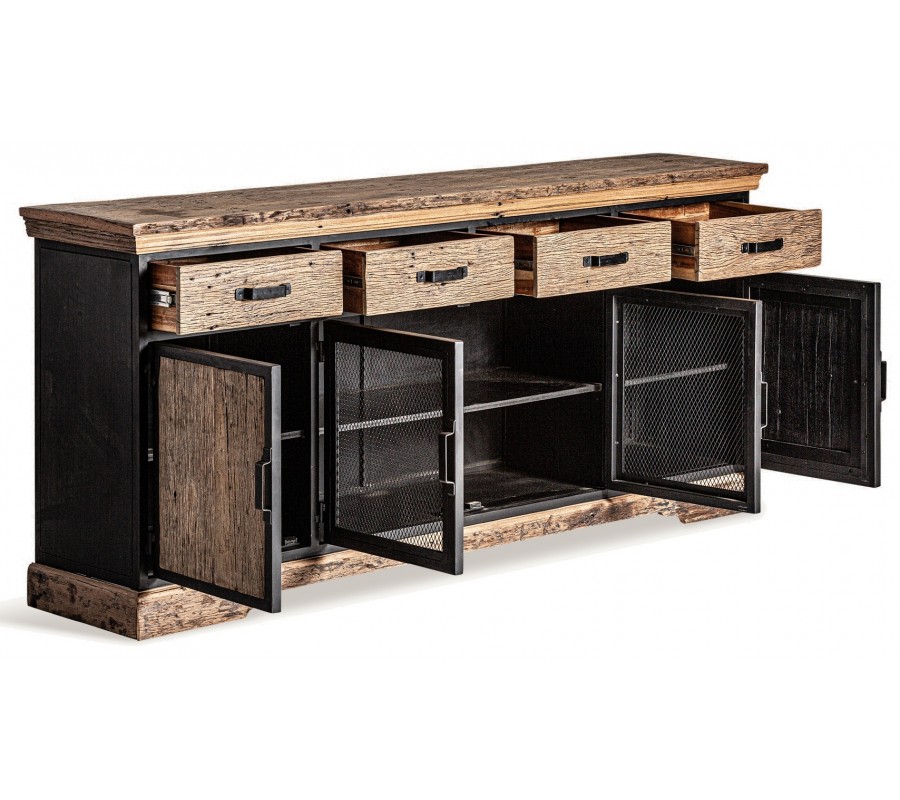 Horná časť príborníka je vybavená štyrmi zásuvkami s čiernymi kovovými úchytkami, ktoré sú funkčné a zároveň esteticky zapadajú do industriálneho rámu. V spodnej časti sa nachádzajú štyri dvierka – dve z čierneho kovu s dekoratívnym dierovaným výpletom, ktoré umožňujú čiastočný pohľad dovnútra, a dve z masívneho dreva v rôznych prírodných tónoch.