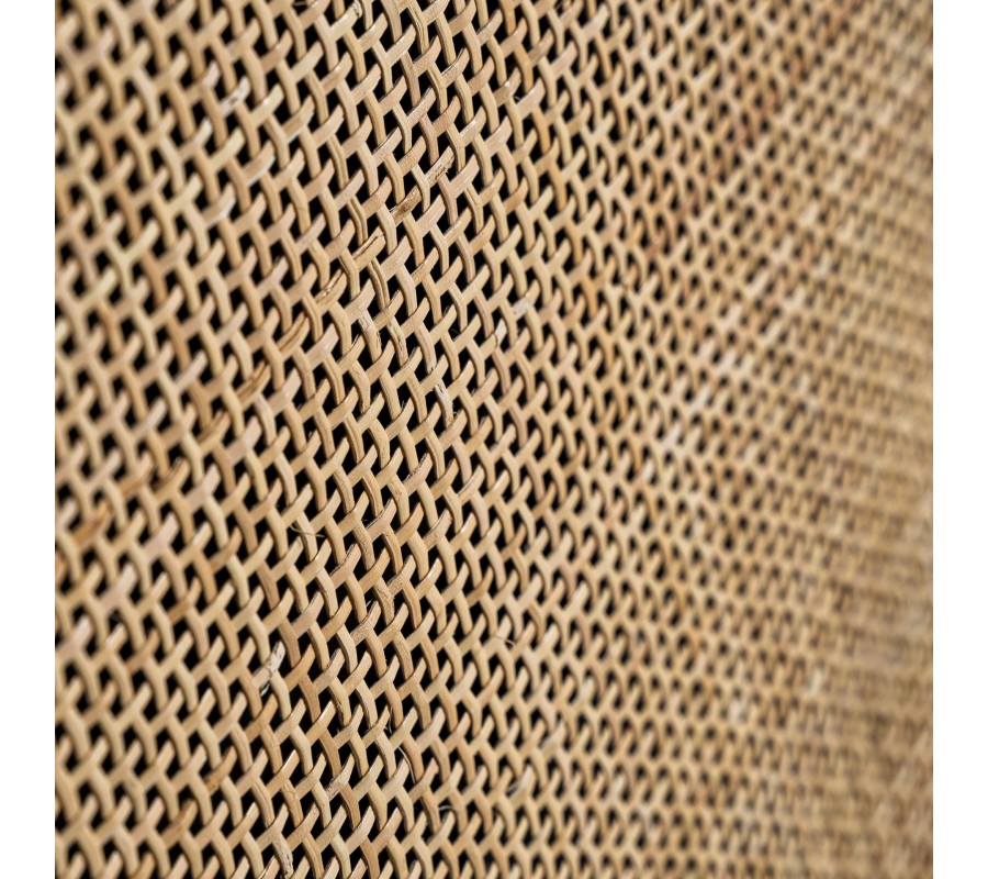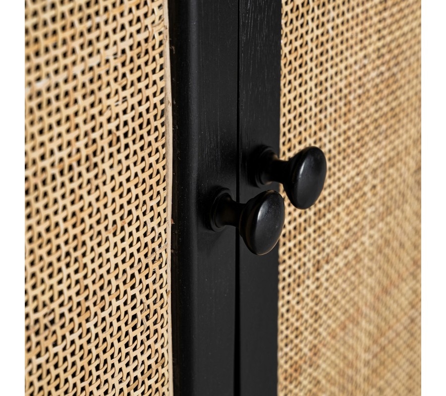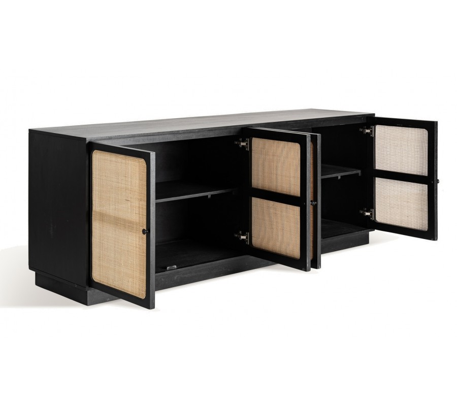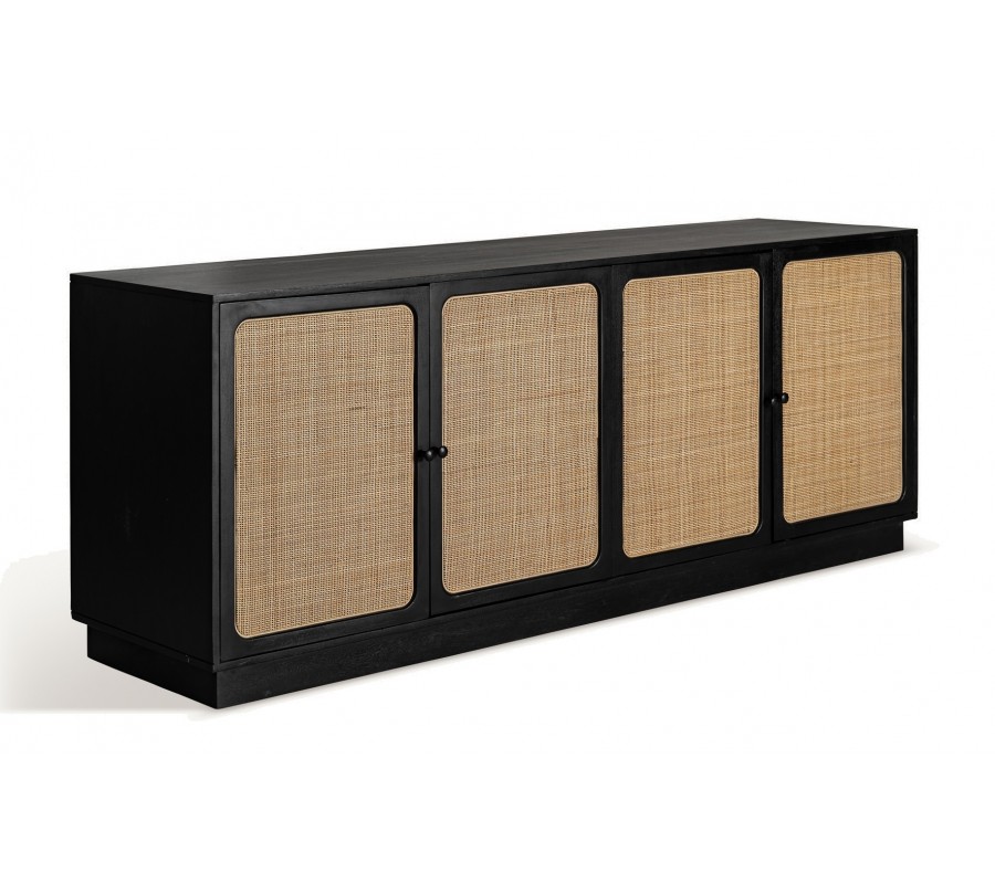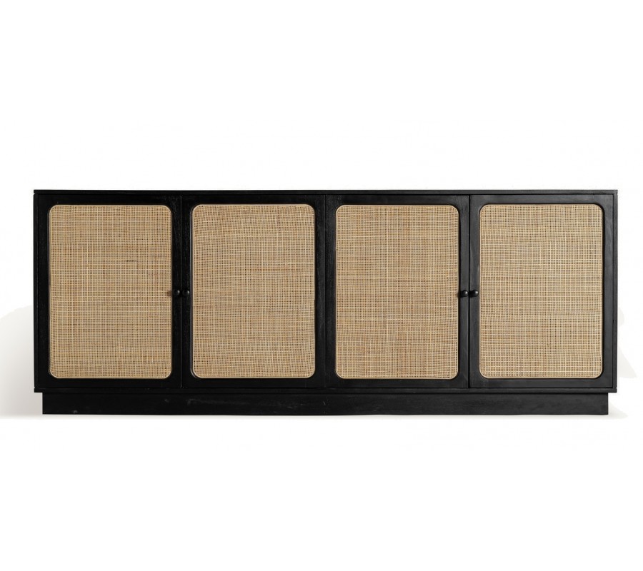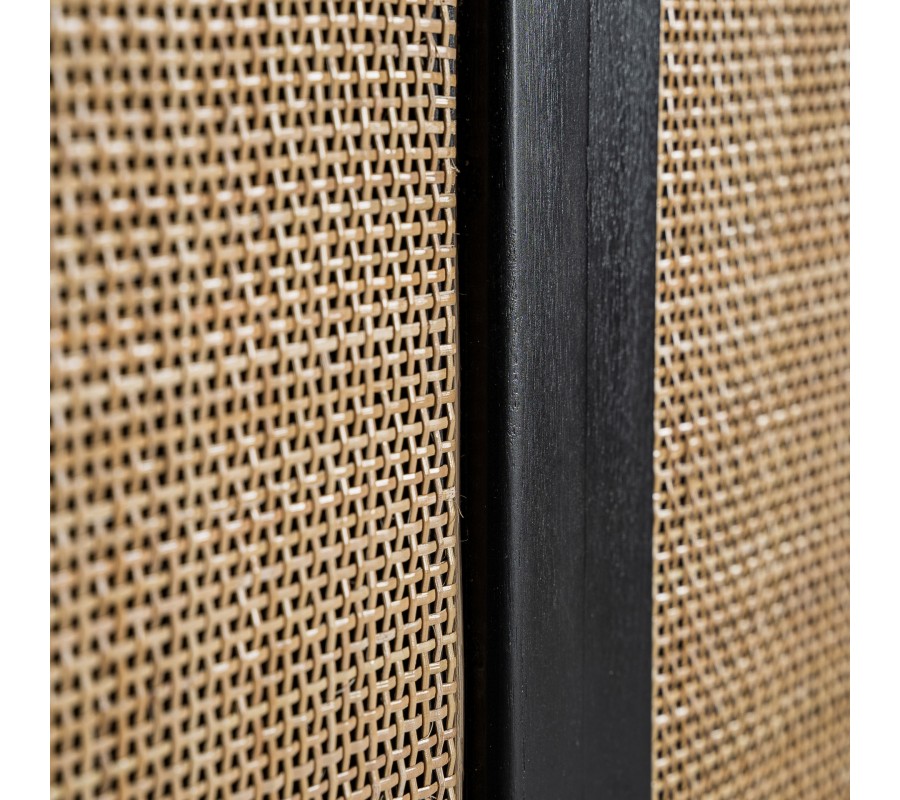 Luxusný etno štvordverový čierny obdĺžnikový príborník Morino z masívneho dreva s hnedým výpletom 206 cm