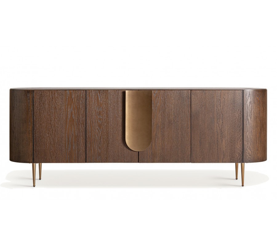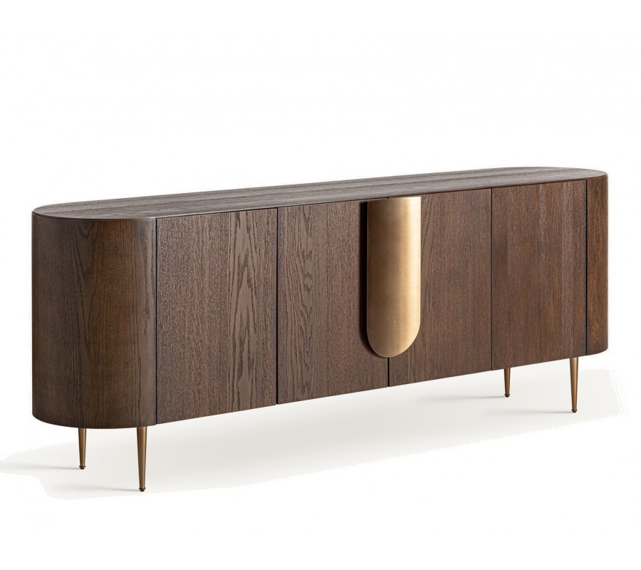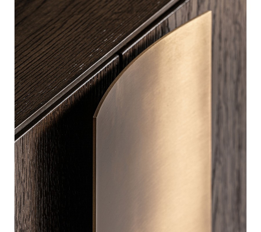 Príborník má štyri dvierka, ktoré ukrývajú dve vnútorné police na praktické uloženie riadu alebo dekorácií. Výrazným dizajnovým prvkom je zlatý detail v tvare polkruhu medzi dvierkami, ktorý dodáva nábytku luxusný vzhľad a podčiarkuje art deco charakter. Jemne brúsené drevo dopĺňajú štíhle kovové nožičky v zlatej farbe, ktoré zabezpečujú stabilitu a vizuálnu ľahkosť.