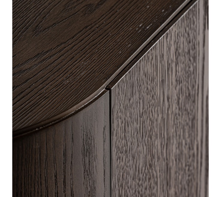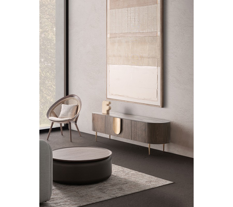 Luxusný príborník Nisi v art deco štýle spája sofistikovanú eleganciu s organickými tvarmi a prémiovými materiálmi. Jeho obdĺžnikový dizajn s oblými rohmi pôsobí harmonicky a vďaka prirodzenej štruktúre letokruhov z dyhy dubového dreva prináša do interiéru pocit prírodnej autenticity.