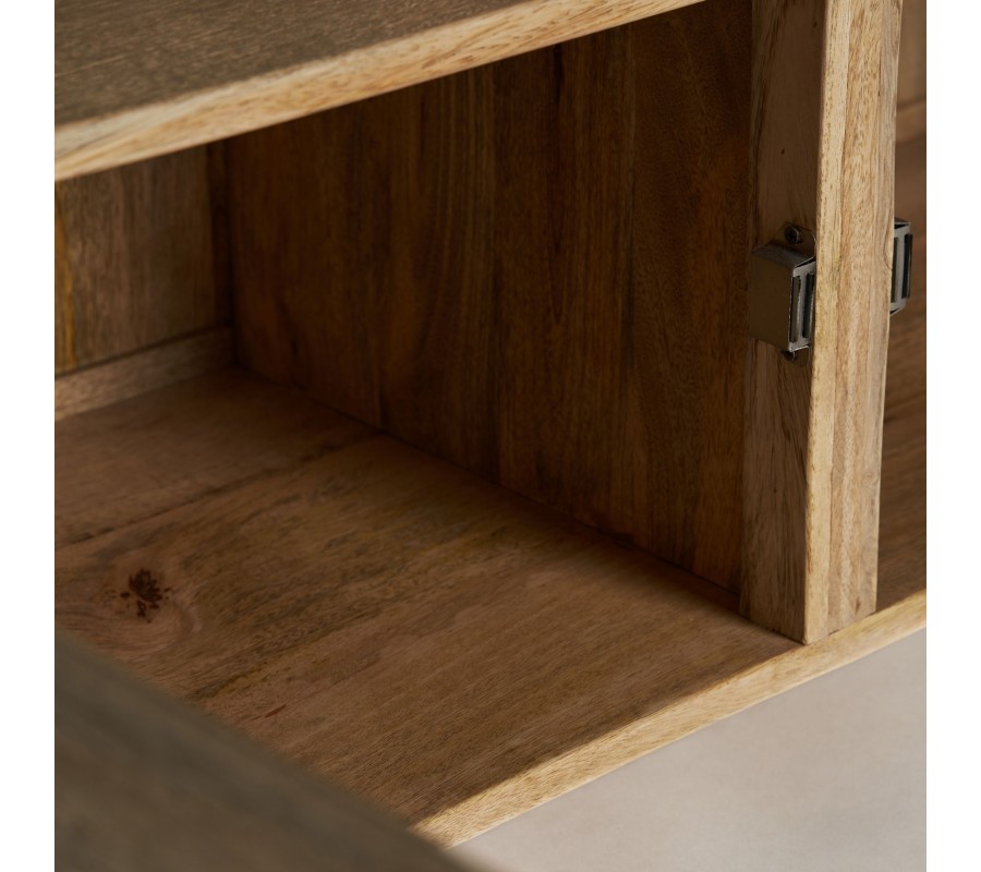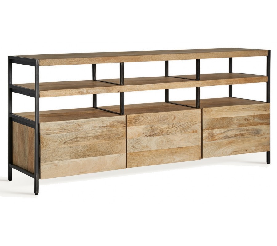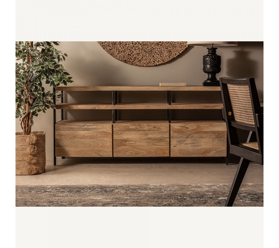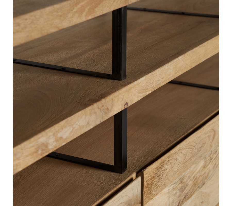 Luxusný industriálny príborník Malisa zaujme a kontrastom materiálov, ktoré spájajú industriálnu surovosť s prírodným teplom. Obdĺžnikový tvar a otvorená konštrukcia zvýrazňujú funkčný charakter, zatiaľ čo masívne mangové drevo vyniká výraznou kresbou letokruhov a prirodzenými odtieňmi hnedej, ktoré dodávajú nábytku autentickosť.