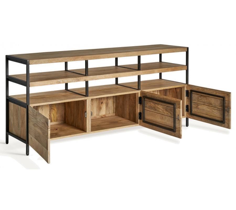 Luxusný industriálny trojdverový masívny obdĺžnikový príborník Malisa so šiestimi policami a čiernou kovovou konštrukciou 170 cm