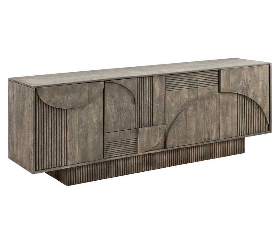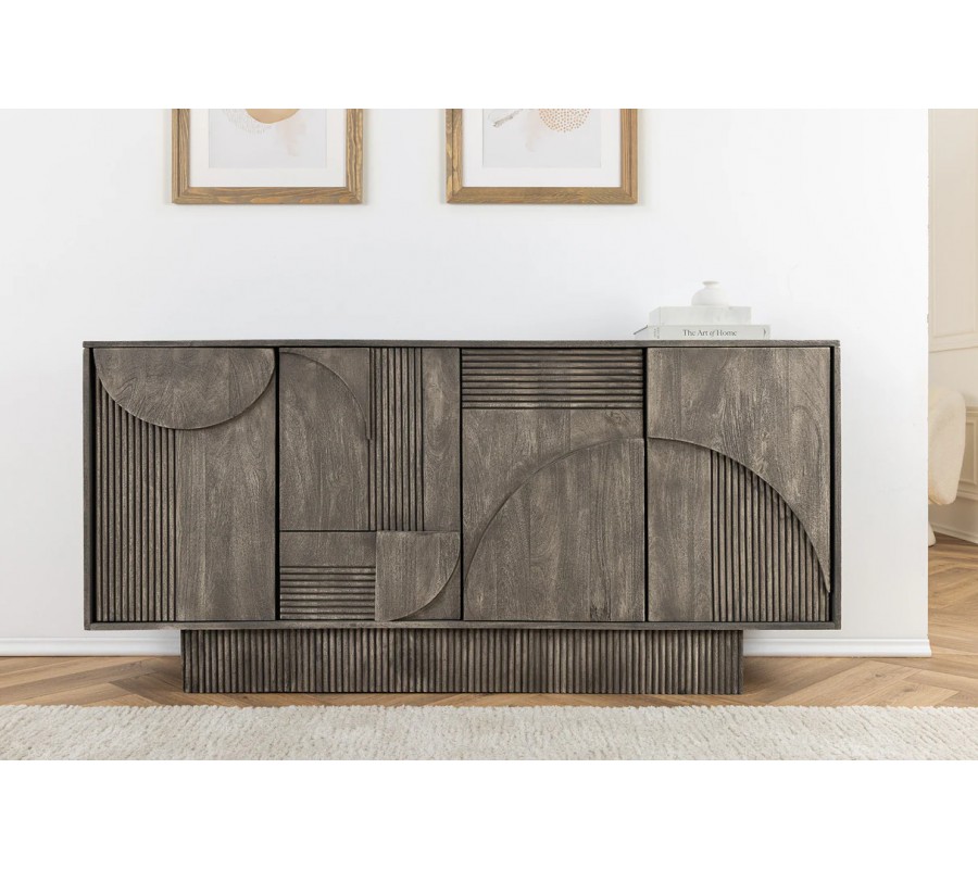 Dizajnový sivý art deco obdĺžnikový príborník Sonia z mangového dreva so štyrmi dvierkami s geometrickým reliéfom 170 cm