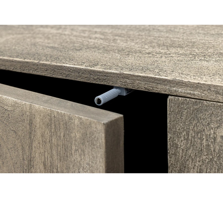 Obdĺžnikový art deco príborník Sonia z masívneho mangového dreva v dymovo sivej povrchovej úprave vnáša do interiéru nádych luxusu, remeselnú kvalitu a vizuálne prepracovaný dizajn.