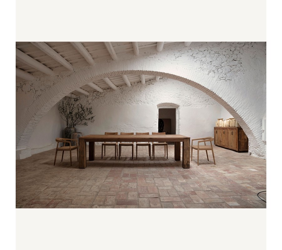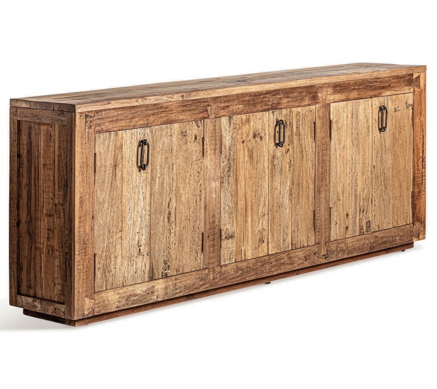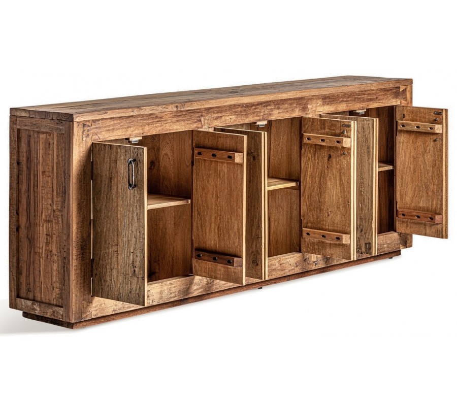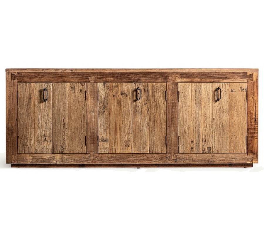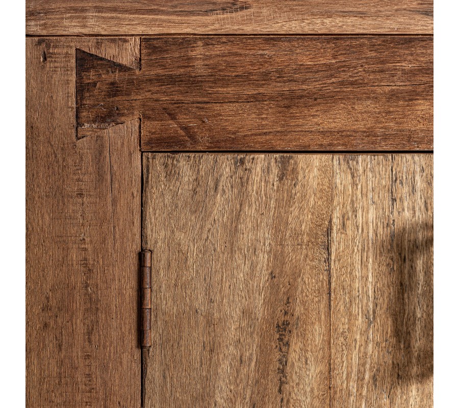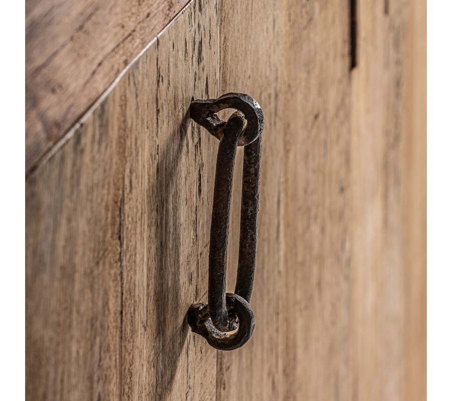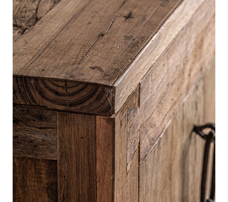 Príborník Goz je majstrovským kúskom koloniálneho nábytku, ktorý kombinuje obdĺžnikový tvar s tradičným vzhľadom masívneho recyklovaného hnedého dreva s výraznou štruktúrou letokruhov. Povrch dreva nesie známky pôvodného spracovania, čo zvýrazňuje jeho autentickosť a prirodzenú krásu.
