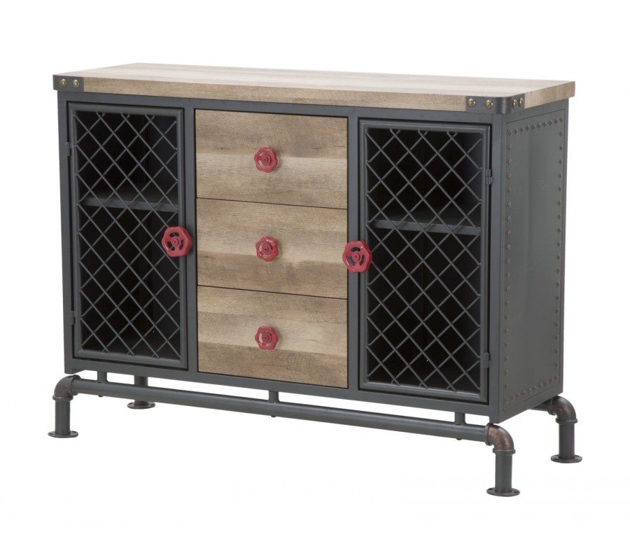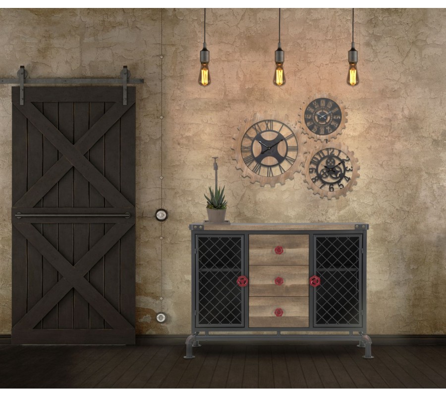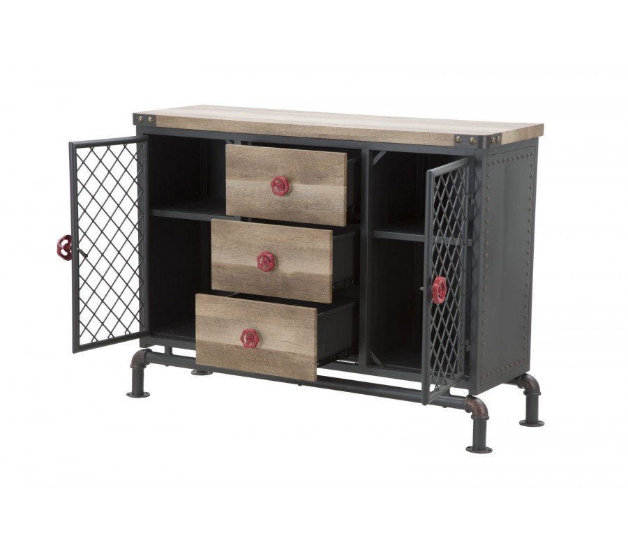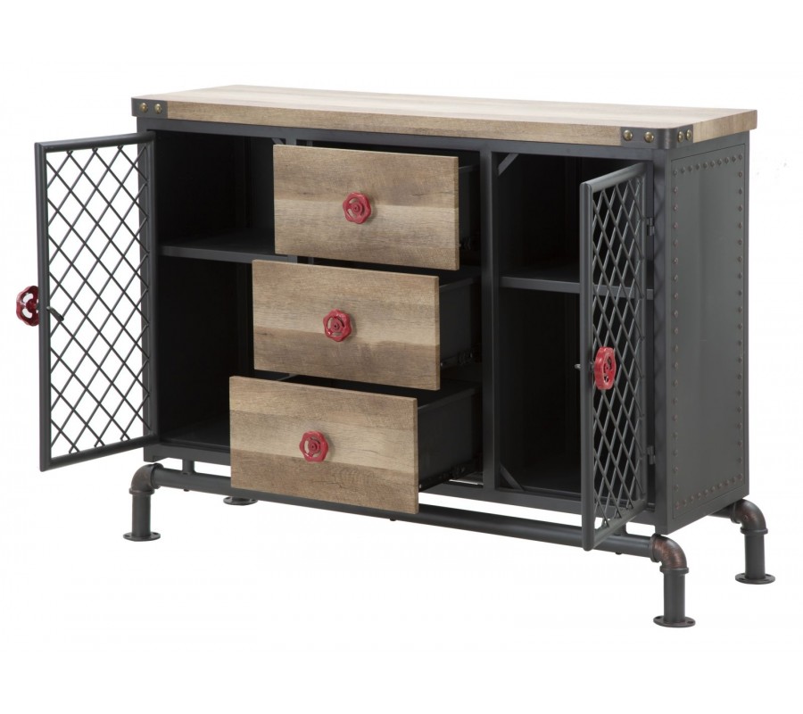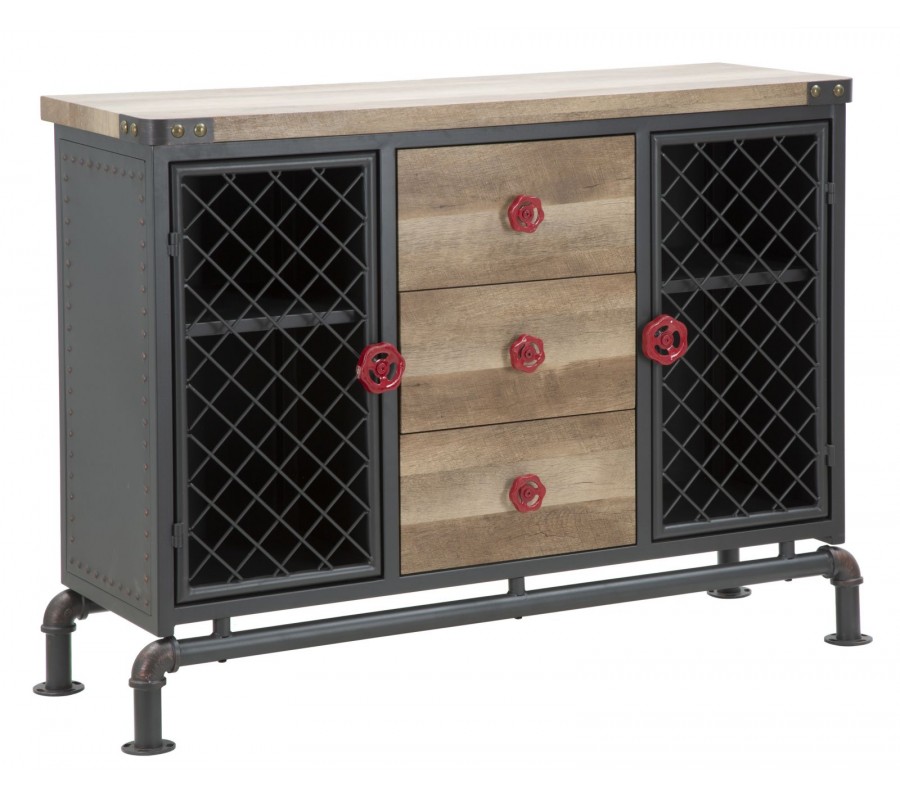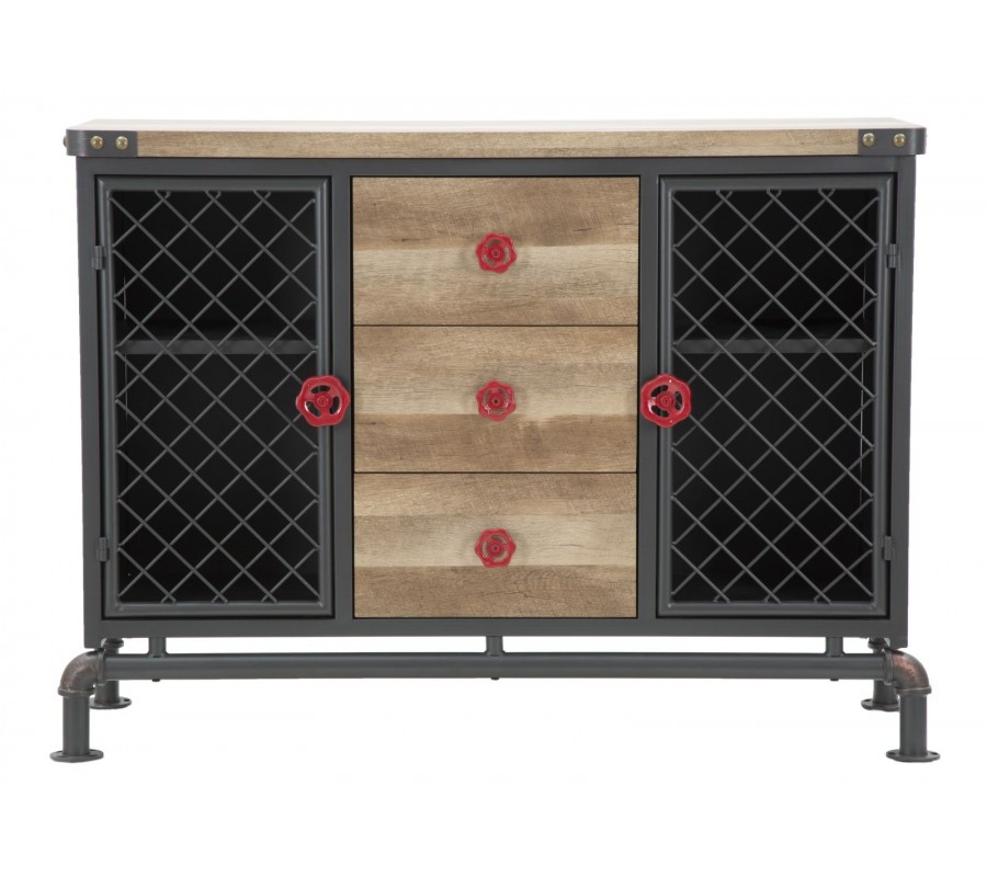 Stredná časť príborníka obsahuje tri zásuvky s masívnymi drevenými čelami a kontrastnými červenými kovovými úchytkami v podobe otočných ventilov, ktoré evokujú technické ovládacie prvky z priemyselného prostredia. Tento detail podčiarkuje autentickosť dizajnu.