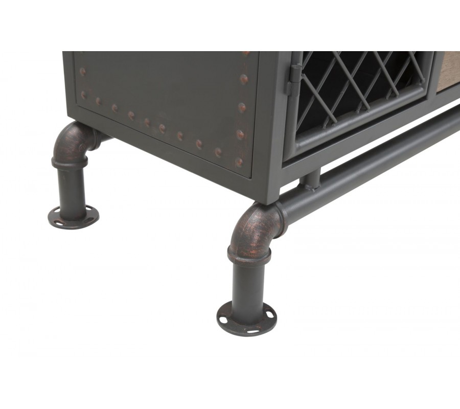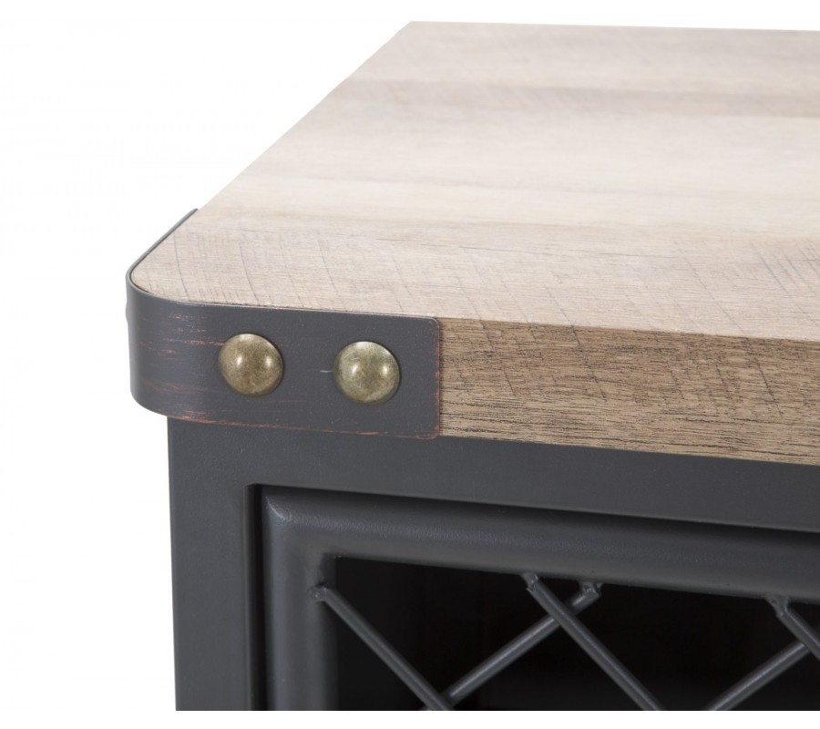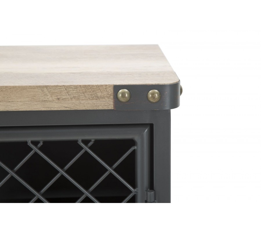 Korpus príborníka, boky, dvierka a nožičky sú vyrobené z kovu s matným čiernym povrchom, zatiaľ čo horná doska a čelá zásuviek sú z dreva s jemne kartáčovaným efektom, ktorý zvýrazňuje štruktúru materiálu. Dvoje kovové dvierka v bočných častiach sú vyplnené priehľadnou kovovou mriežkou, ktorá umožňuje náhľad do vnútra bez úplného odkrytia obsahu – ideálne pre vystavenie riadu či dizajnových kúskov.