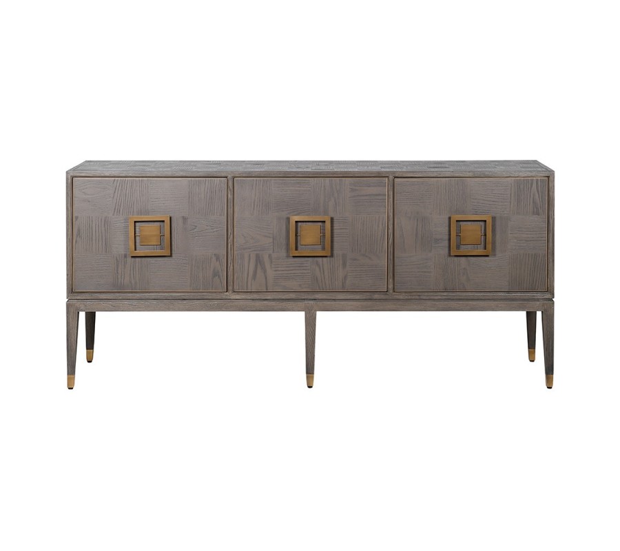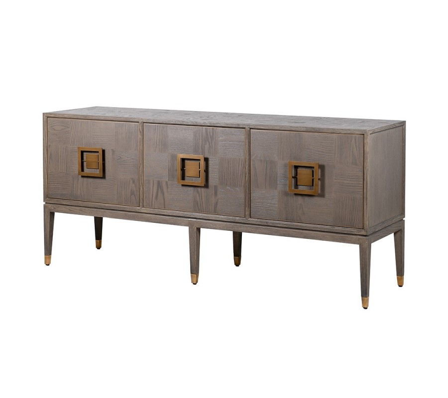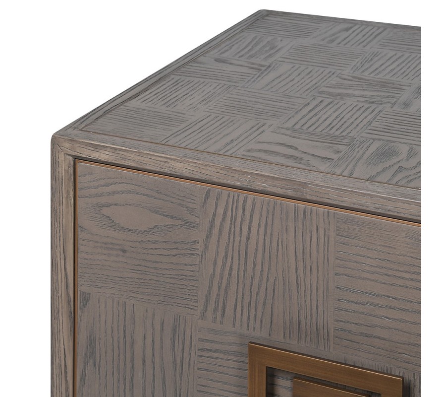 Art deco príborník Quadria Gris v elegantnom sivom prevedení zaujme už na prvý pohľad kombináciou geometrických detailov a precízne spracovaných materiálov. Čelné strany troch dvierok zdobí originálny dekor zo štvorcov, v ktorých sa striedajú vertikálne a horizontálne orientované drevené štruktúry. Tento vzor vytvára vizuálny efekt pripomínajúci šachovnicu, pričom zároveň zvýrazňuje prirodzenú kresbu masívneho dubového dreva a dodáva príborníku rafinovaný umelecký charakter.