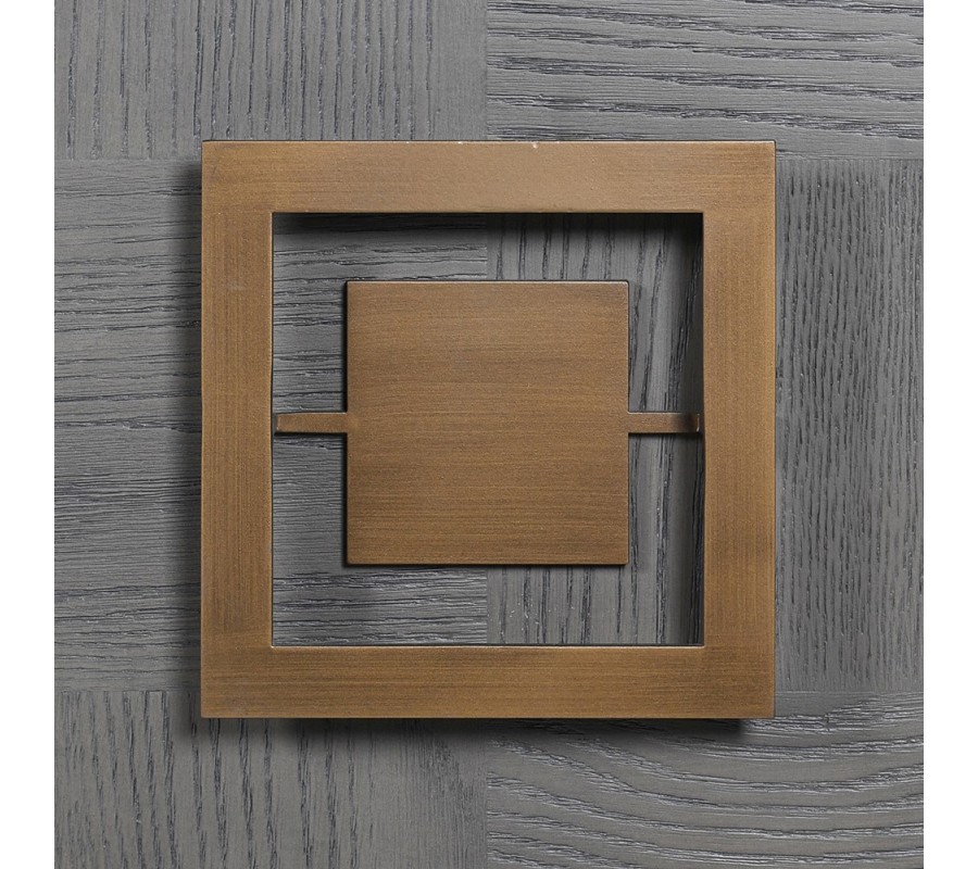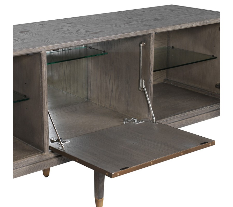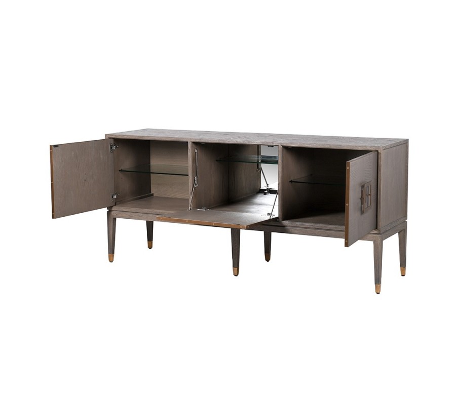 Dvierka sú osadené výraznými bronzovými kovovými úchytkami – tie majú tvar štvorca, pričom vnútorný plochý štvorec je orámovaný vystúpeným väčším štvorcom. Tento detail vytvára elegantný plastický kontrast a posilňuje dojem luxusu. Príborník stojí na šiestich zužujúcich sa hranatých nožičkách, ktoré sú zakončené bronzovým kovovým detailom – celok tak pôsobí opticky odľahčene a mimoriadne sofistikovane.