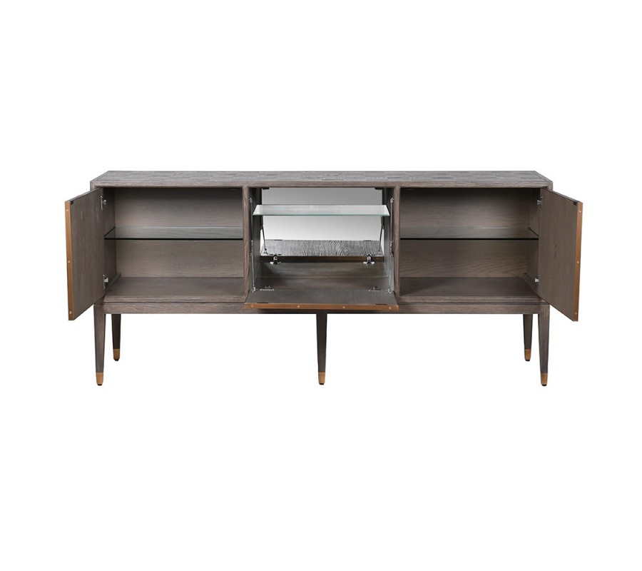 Vnútorný priestor je rozdelený na tri samostatné časti. Stredné dvierka sú vyklápacie smerom nadol a sprístupňujú strednú skrinku, ktorej zadnú stenu tvorí zrkadlový povrch a vo vnútri sa nachádza sklenená polica vo vyššej polohe, ktorá poskytuje elegantný priestor na vystavenie dekoračných kúskov alebo nápojového servisu. Bočné skrinky majú klasicky otváracie dvierka a vo vnútri jednu sklenenú policu. Zadné a bočné steny vnútorného priestoru sú vyhotovené v rovnakom sivom dekore ako exteriér, čím sa zachováva jednotný a harmonický vzhľad.