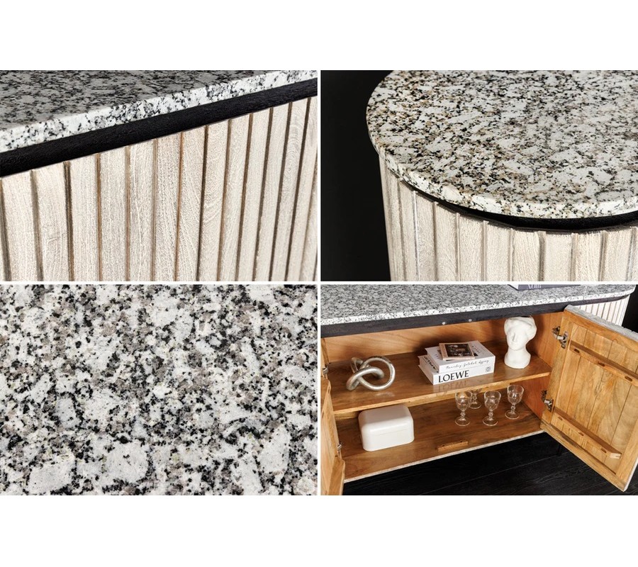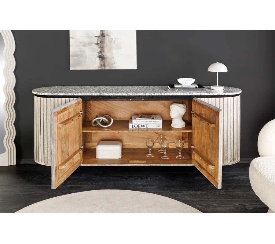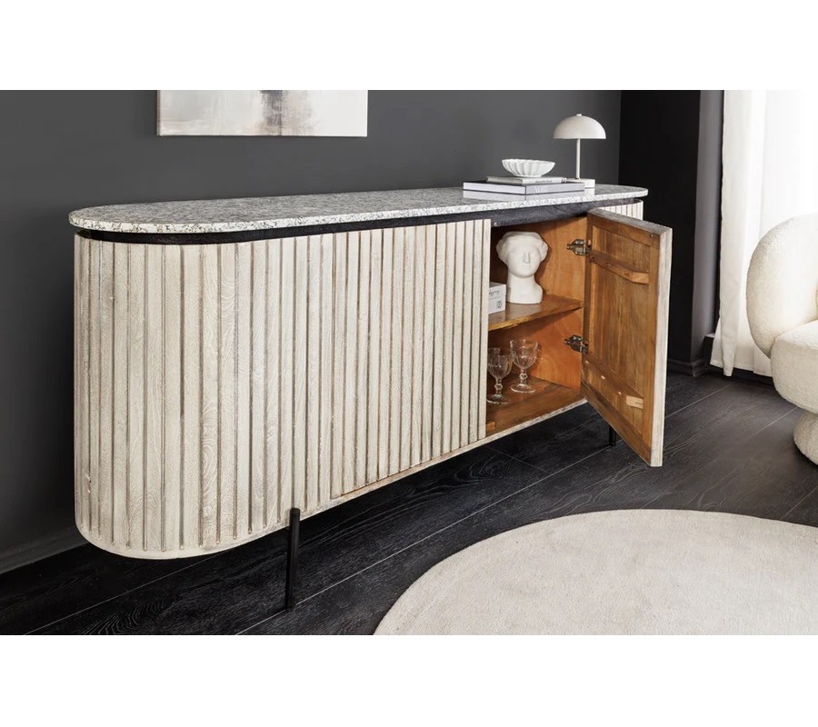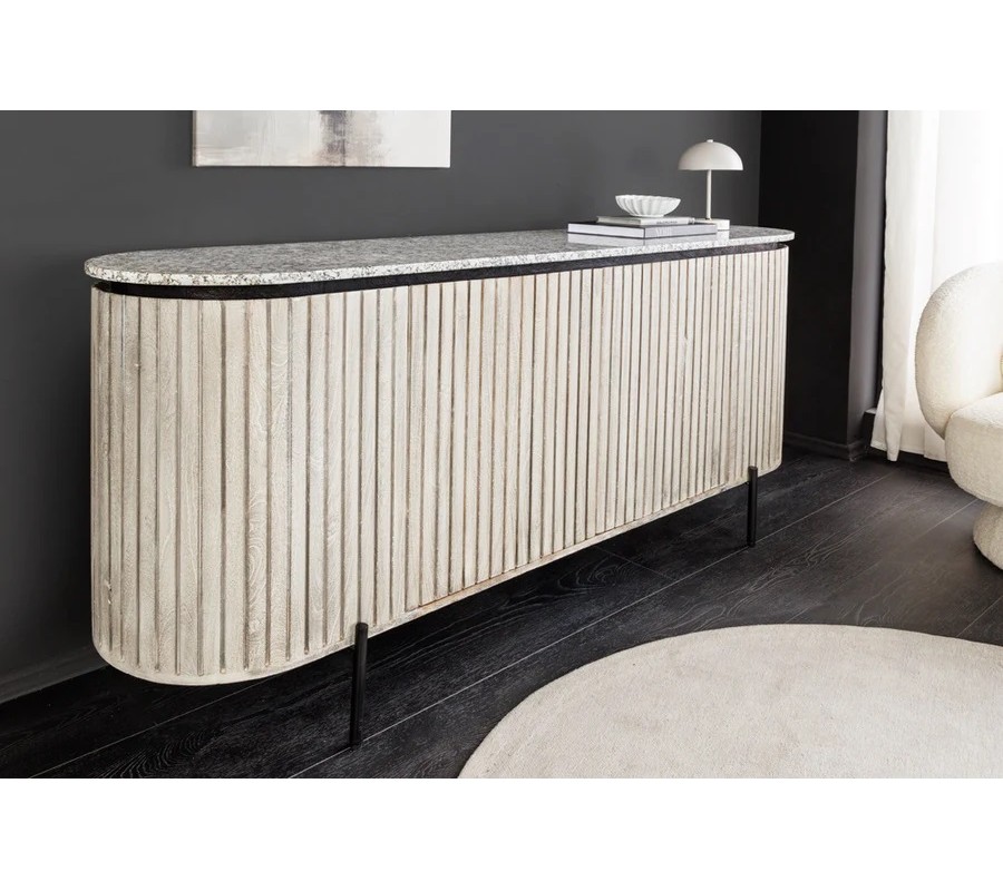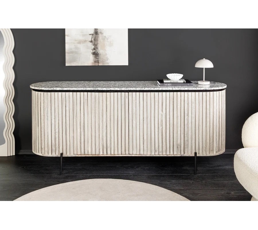 Príborník má elegantnú oválnu siluetu. Vrchná doska je hladká, so zrnitým mramorovým dizajnom v odtieňoch čiernej a sivej na bielom pozadí. Telo zdobí po obvode vertikálny drážkovaný reliéf, vyrezávaný do dreva. Jeho dizajn je inšpirovaný art deco štýlom. Povrch pokrýva svetlý sivý náter, cez ktorý presvitá naturálna kresba dreva. Vzniká tak efekt jemne vymytej farby, ktorý pôsobí vintage dojmom. Čierne nožičky majú štíhly minimalistický valcovitý tvar, ktorý korešponduje s reliéfnym zdobením a prináša dotyk moderného štýlu.