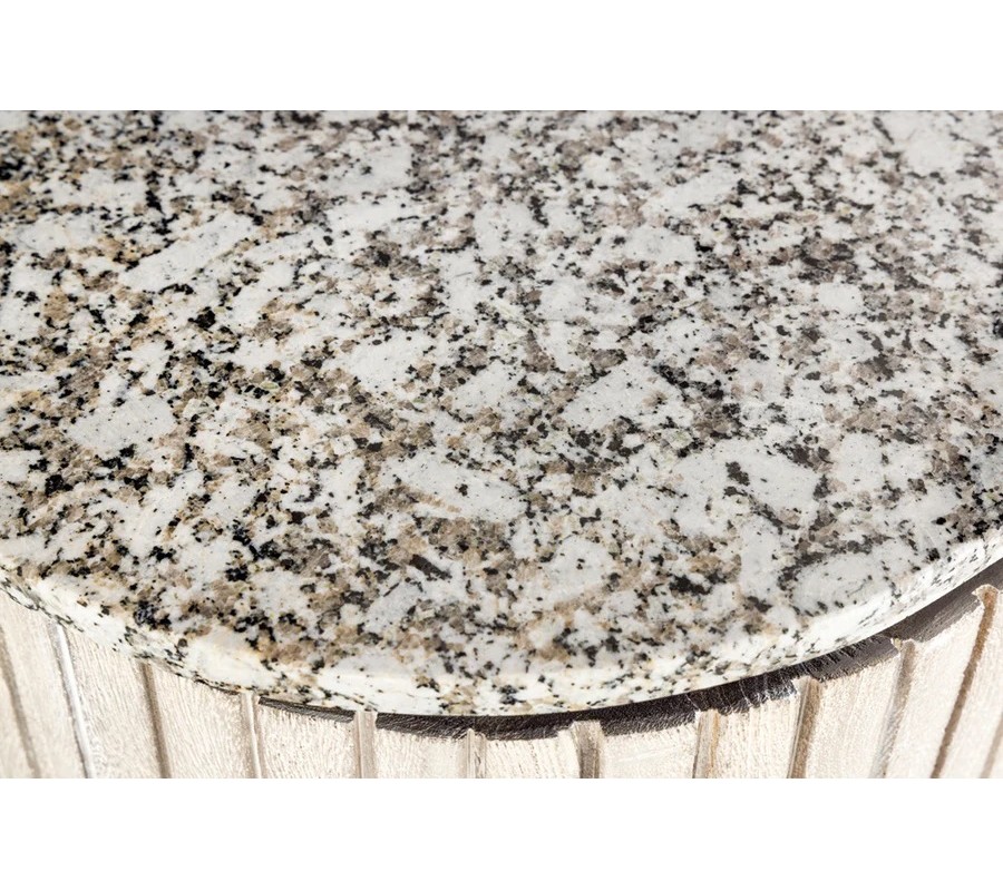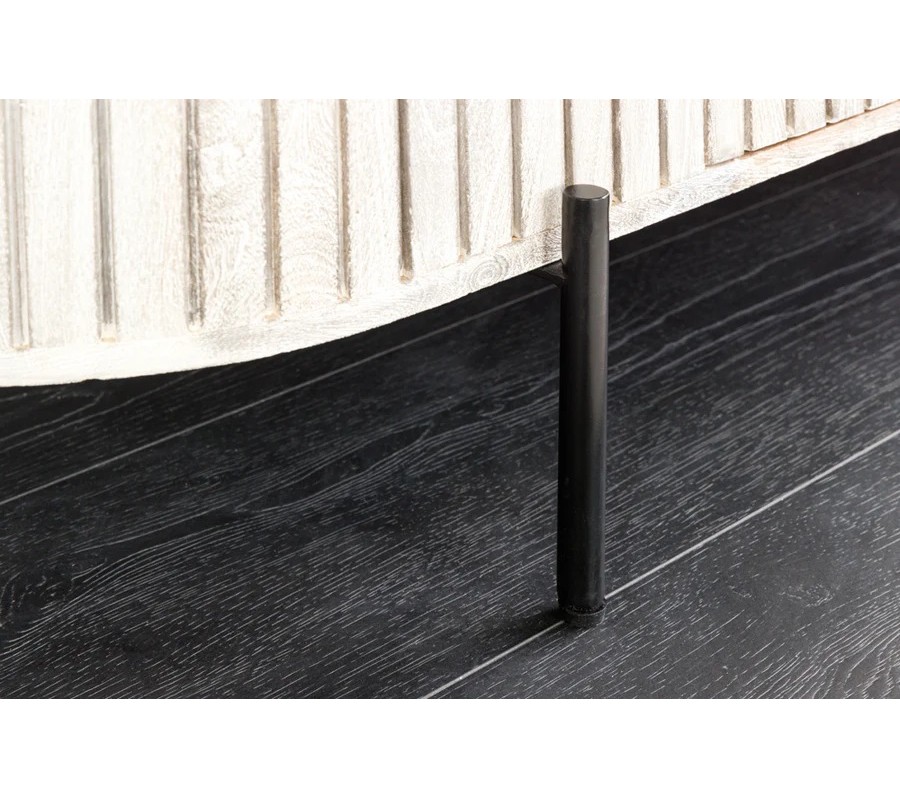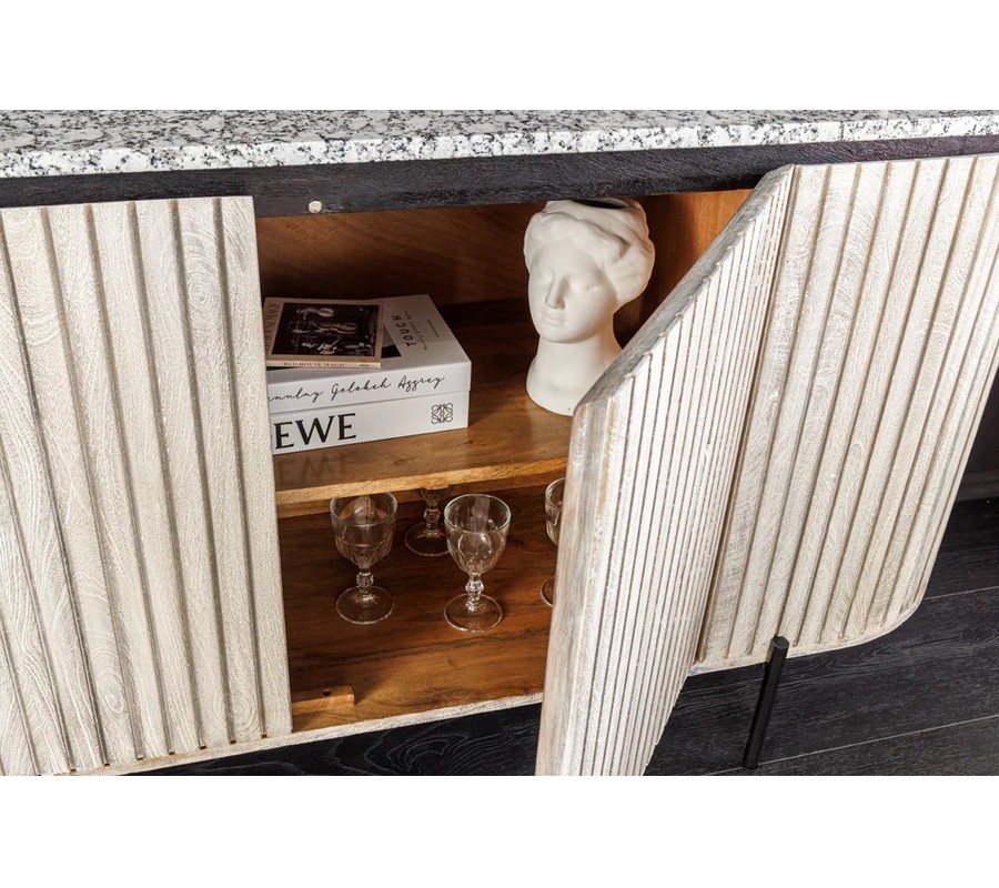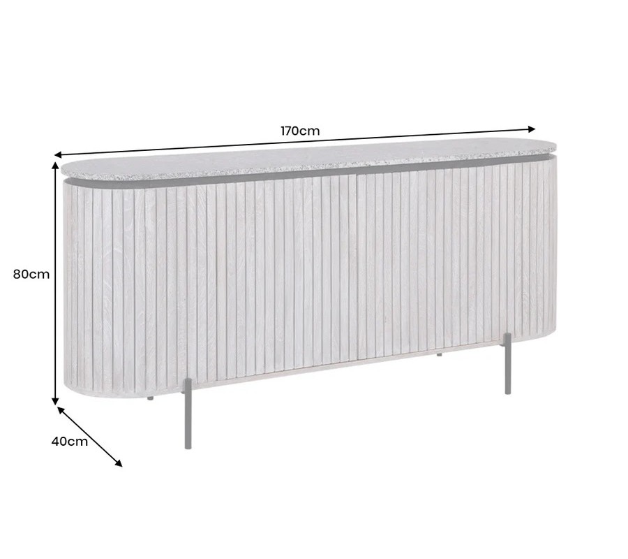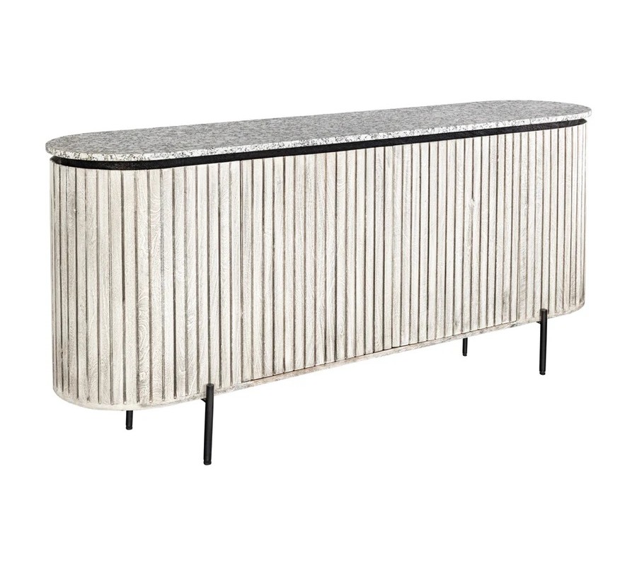 Príborník má elegantnú oválnu siluetu. Vrchná doska je hladká, so zrnitým mramorovým dizajnom v odtieňoch čiernej a sivej na bielom pozadí. Telo zdobí po obvode vertikálny drážkovaný reliéf, vyrezávaný do dreva. Jeho dizajn je inšpirovaný art deco štýlom. Povrch pokrýva svetlý sivý náter, cez ktorý presvitá naturálna kresba dreva. Vzniká tak efekt jemne vymytej farby, ktorý pôsobí vintage dojmom. Čierne nožičky majú štíhly minimalistický valcovitý tvar, ktorý korešponduje s reliéfnym zdobením a prináša dotyk moderného štýlu.